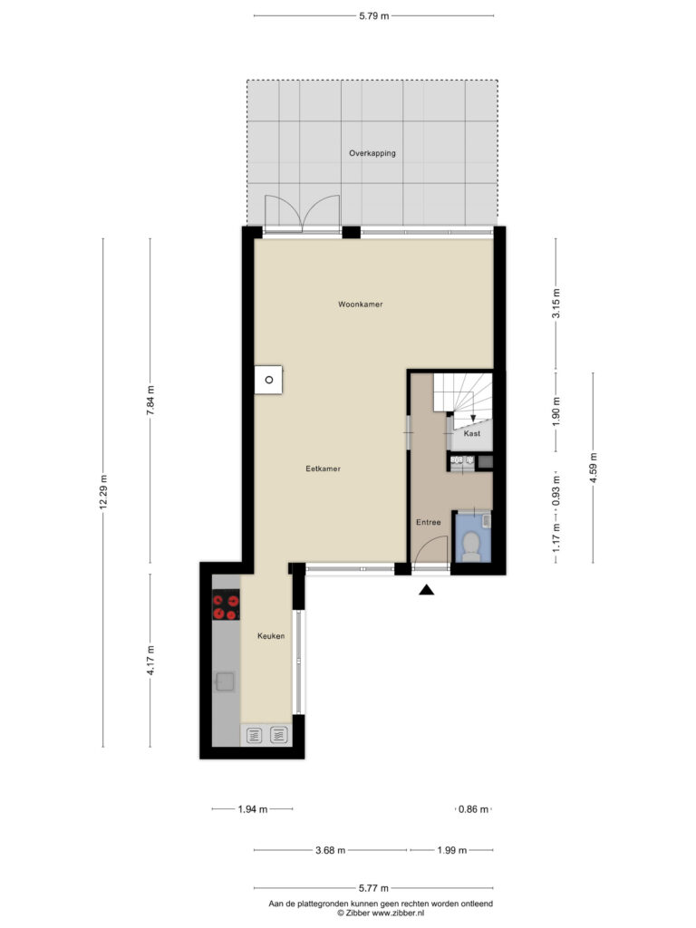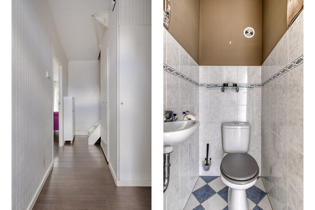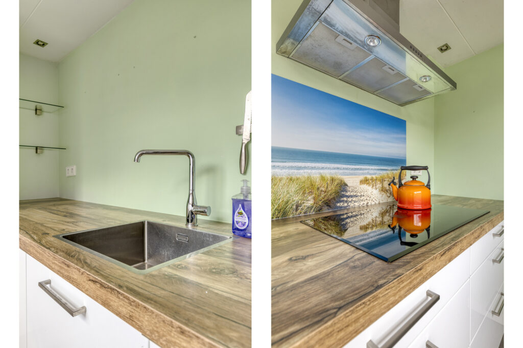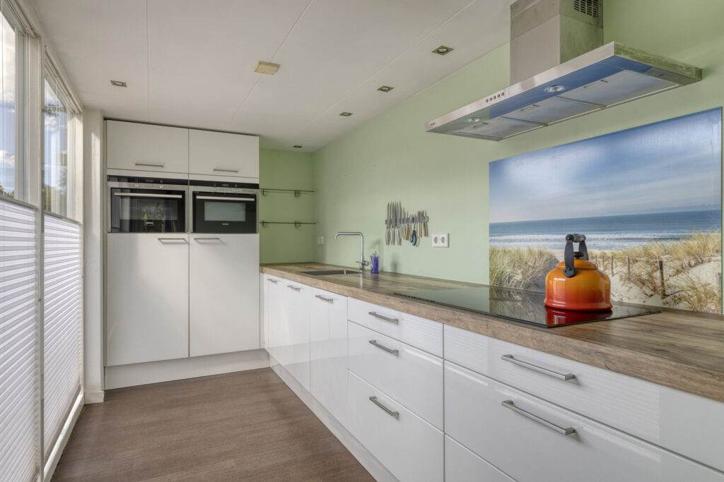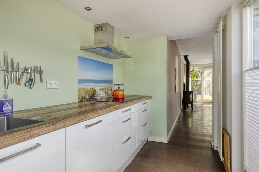 Indeling: voorentree; hal met meterkast en toilet; tuingerichte woonkamer met houtkachel; eethoek; halfopen keuken met inductiekookplaat, afzuigkap, oven, combioven, vaatwasser, vriezer en koelkast.