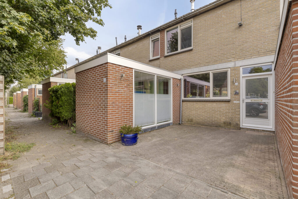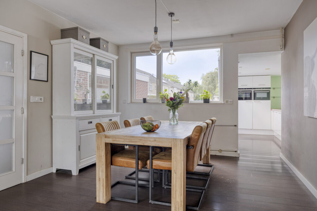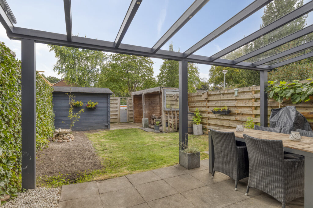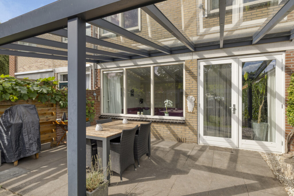 Het woonhuis beschikt over een ruime woonkamer en eethoek omdat de keuken verplaatst is naar de voormalige bijkeuken. Naast de ruimte in de woonkamer is het ook heerlijk vertoeven onder de terrasoverkapping. De overkapping bestaat uit een glazen dak en is op het zuiden gelegen.