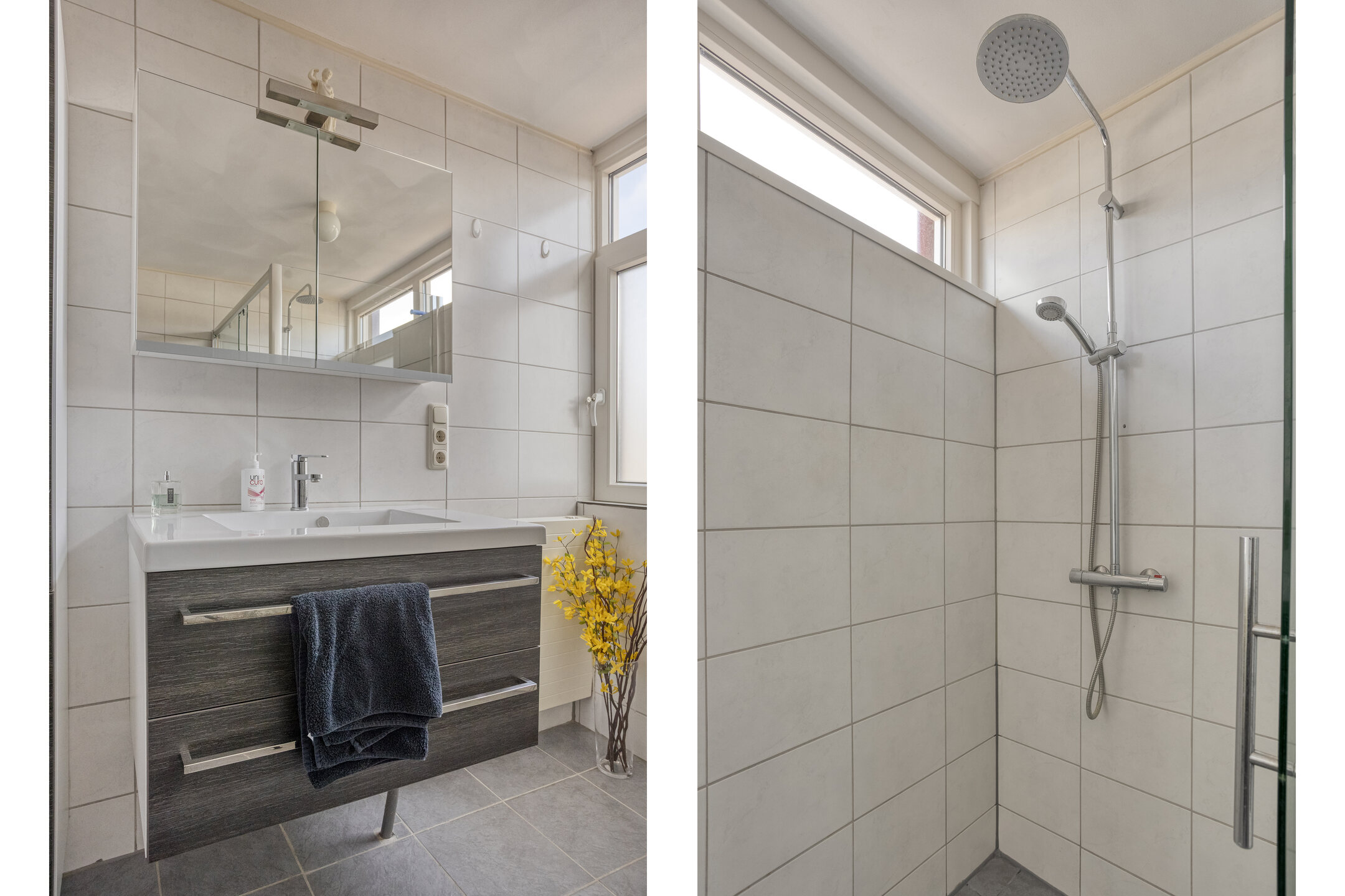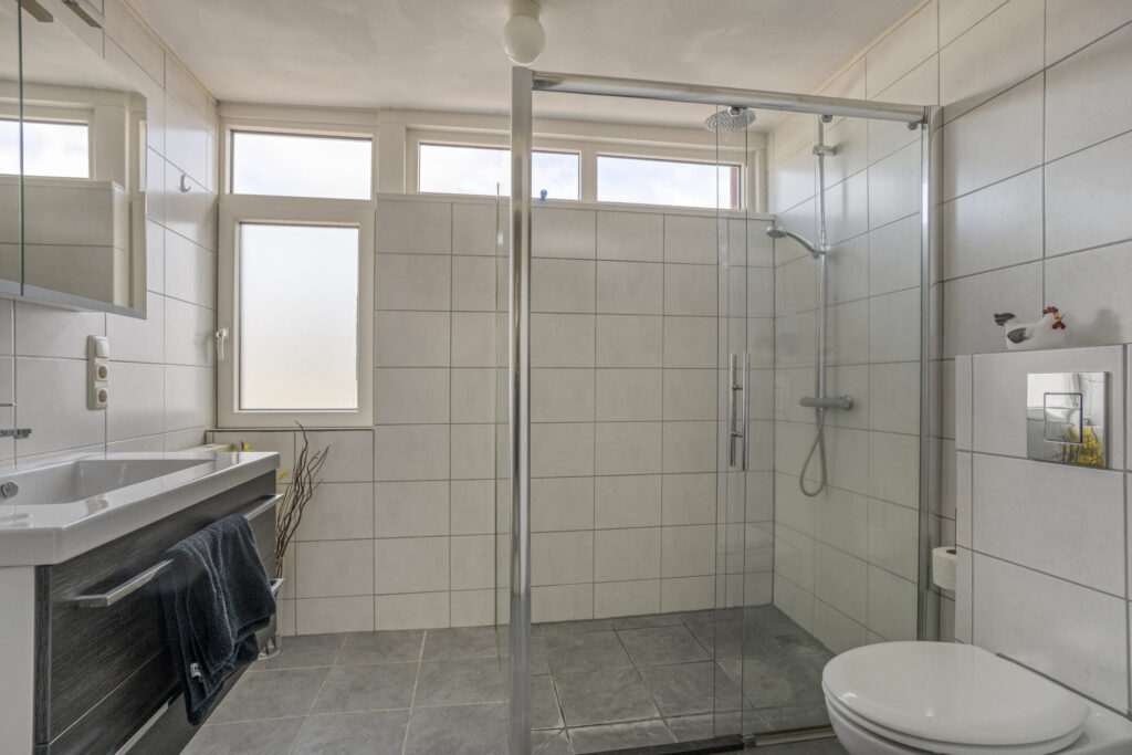 Eerste verdieping: overloop met bergkast; grote slaapkamer aan de voorzijde (voormalig 2 slaapkamers); slaapkamer achterzijde; vergrootte badkamer met inloopdouche, wastafelmeubel en toilet.