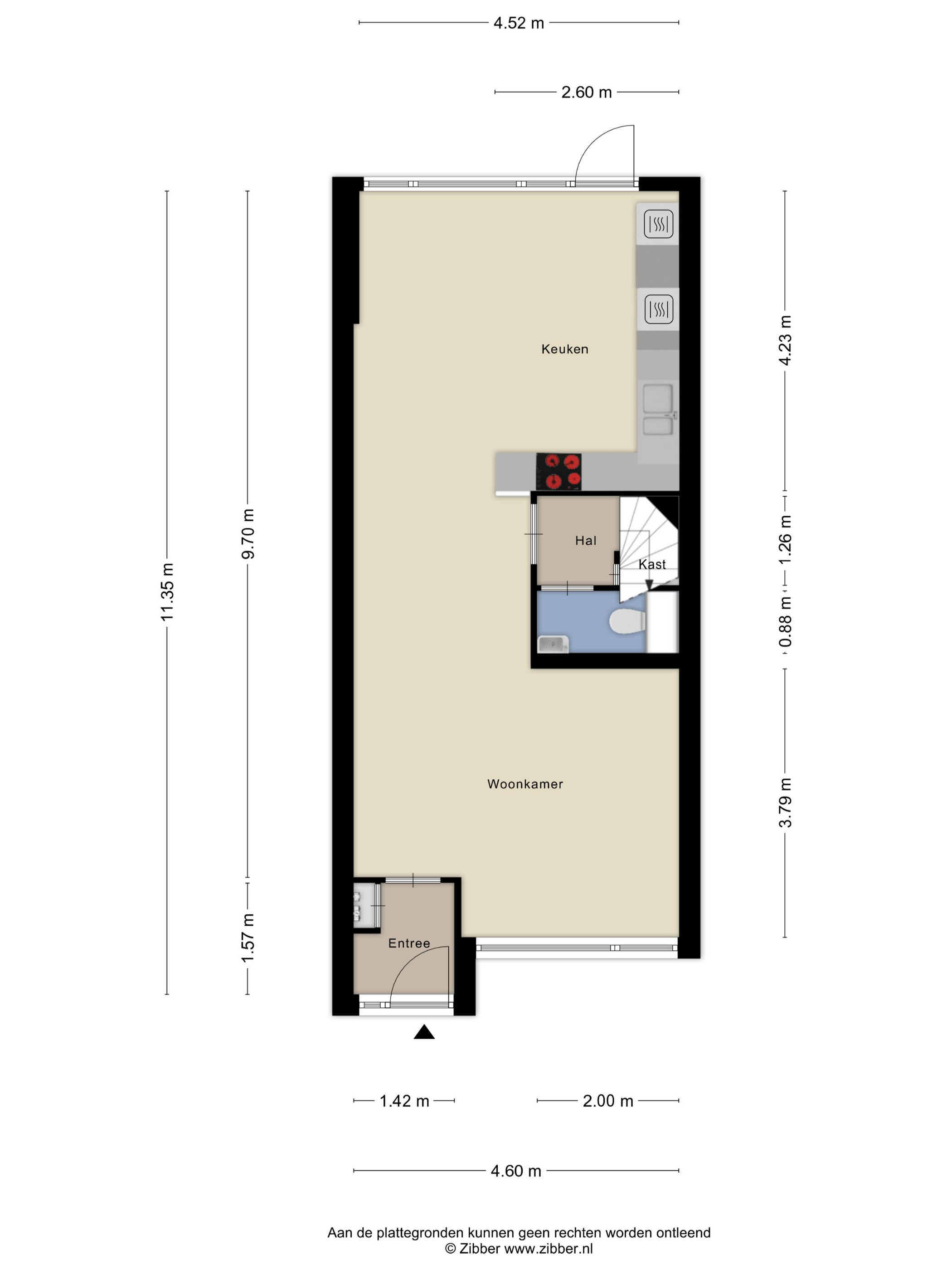 Indeling: voorentree; hal met meterkast; straatgerichte woonkamer; uitgebouwde woonkeuken met keukenopstelling die voorzien is van inductiekookplaat, afzuigkap, koelkast, vriezer, oven en vaatwasser; tussenhal met trapopgang en toilet.