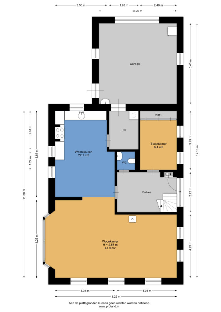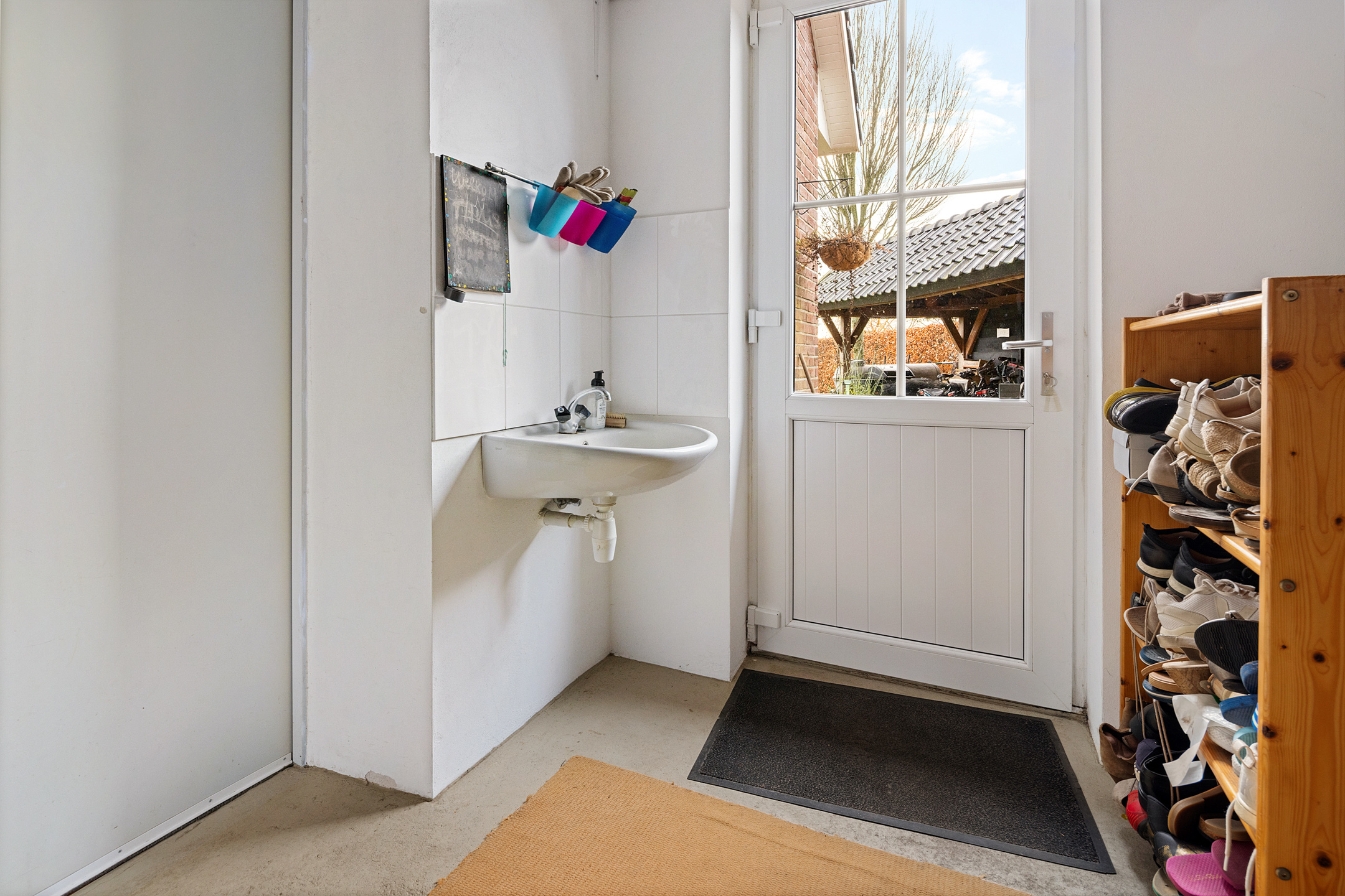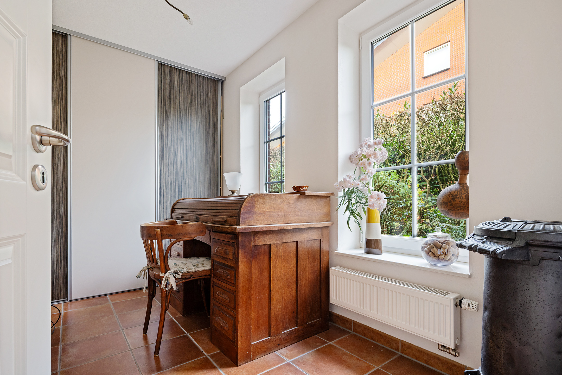Entree, ruime centrale hal met toilet, trapopgang naar de verdieping en toegang tot een slaapkamer van ca. 8 m² (thans in gebruik als kantoor) Vanuit de hal is er tevens toegang tot de woonkamer van ca. 42 m² met veel lichtinval, een parketvloer en een houtkachel. De schuifpui in de woonkamer geeft direct toegang tot de tuin, waardoor je een perfecte overgang naar het buitenleven hebt. Aansluitend de woonkeuken van ca. 22 m² met keukenblok in hoekopstelling voorzien van inbouwapparatuur zoals gasfornuis met afzuigkap, vaatwasser, oven en koelkast. Via de keuken heb je toegang tot de bijkeuken en de garage van ca. 29 m² met achterentree.