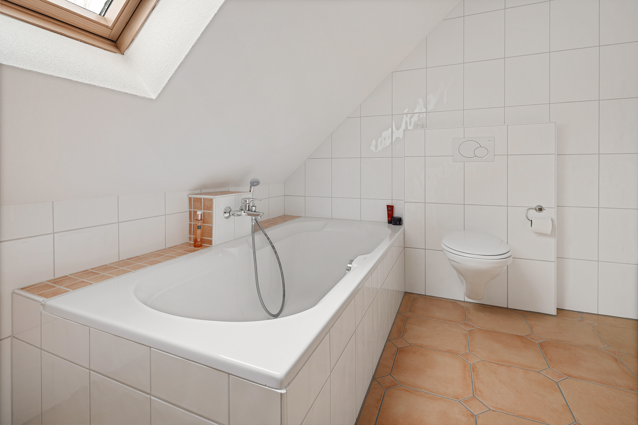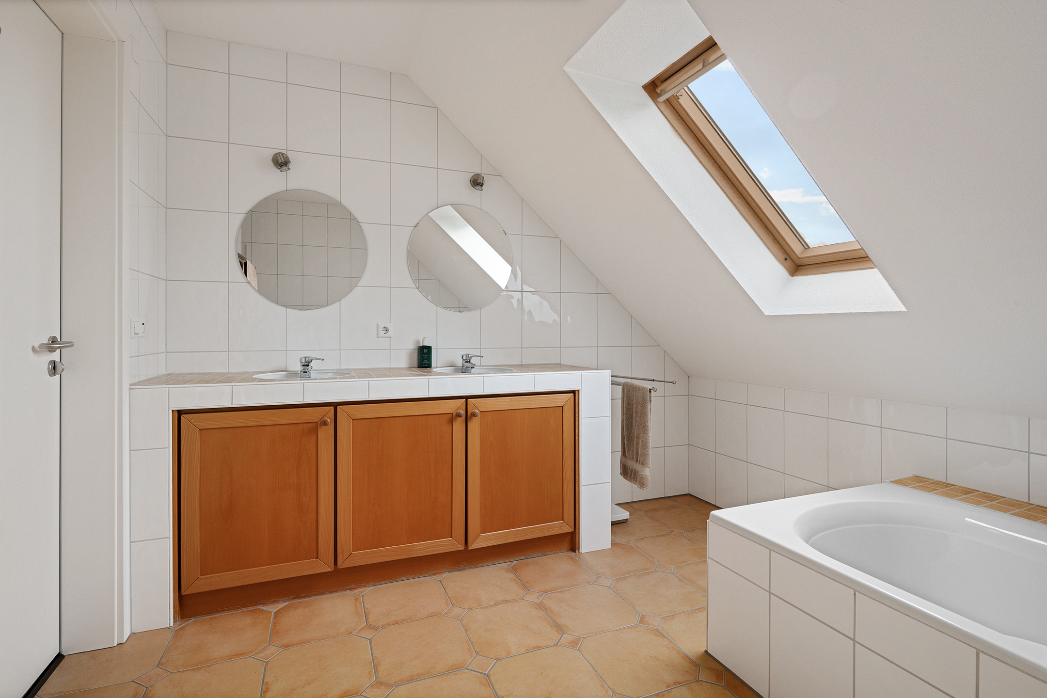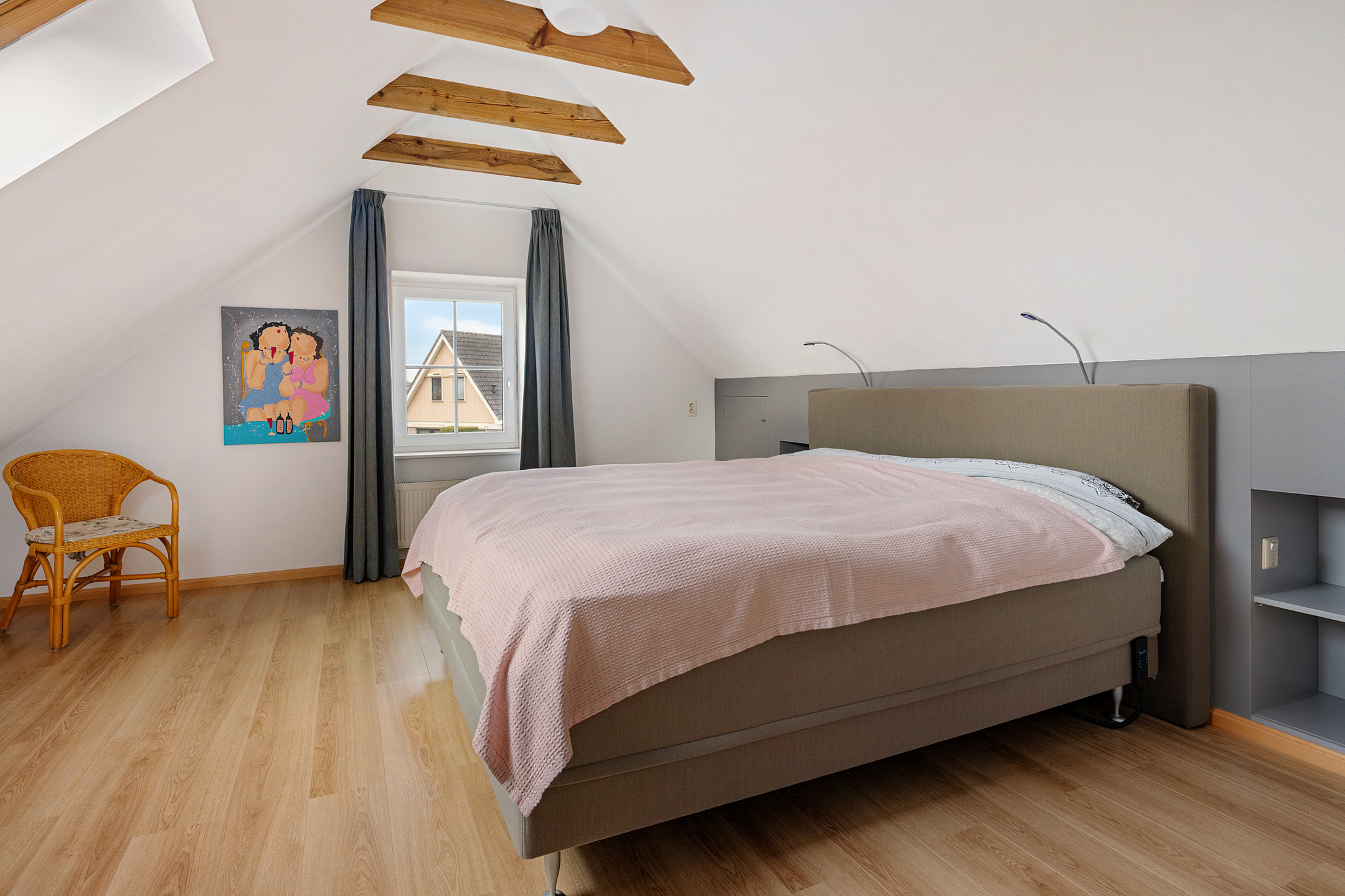 Op de verdieping middels een overloop toegang tot 5 slaapkamers van ca. 8, 11, 12, 12 en 15 m² en de badkamer. De badkamer van ca. 8 m² is voorzien van een ligbad, douche, tweede toilet en dubbele wastafel. De bergzolder is te bereiken middels een vlizotrap op de overloop. De gehele bovenverdieping is voorzien van een laminaatvloer.