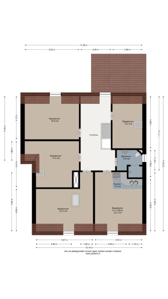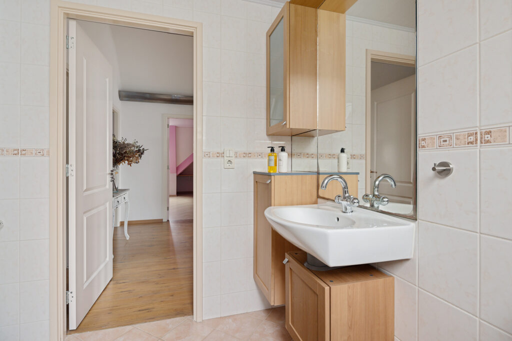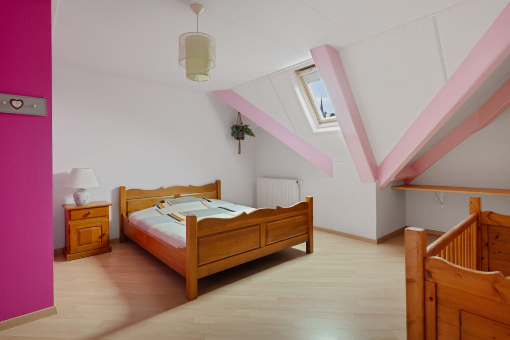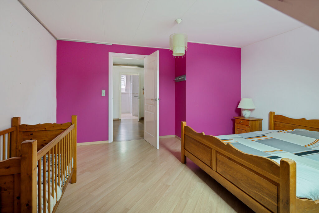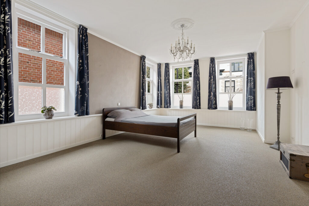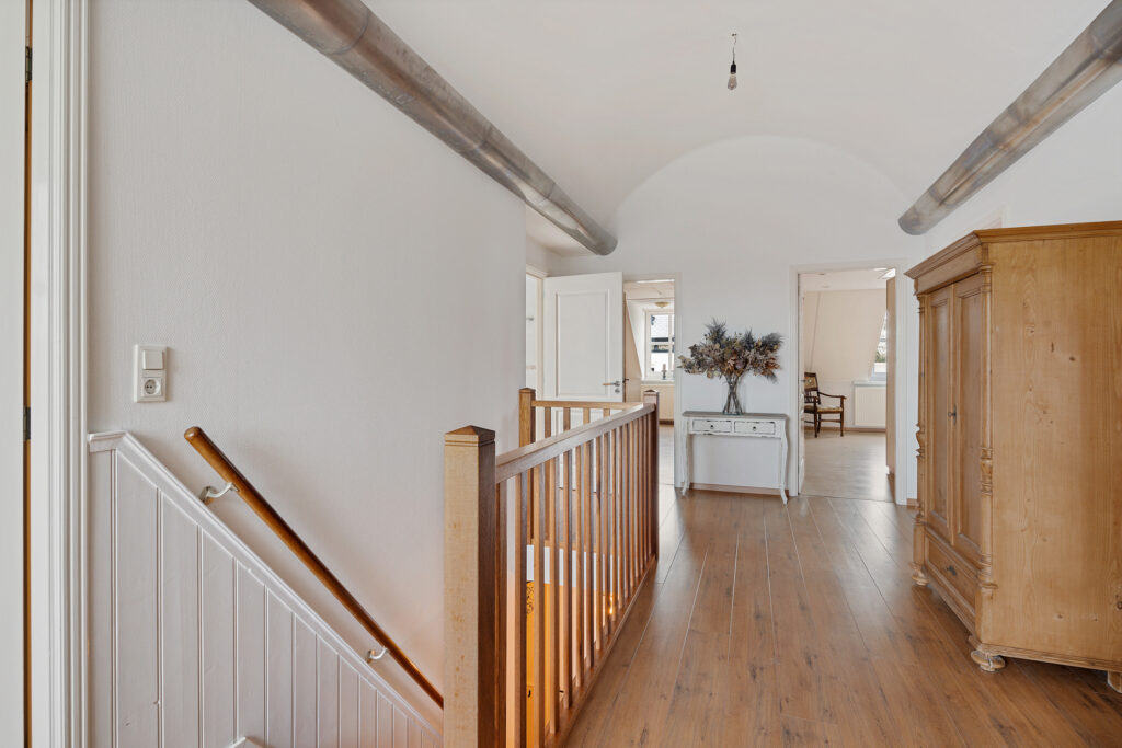 Verdieping: overloop met toegang tot 5 slaapkamers van ca. 12, 17 18, 21 en 22 m², en de 2e badkamer met douche, toilet en wastafel. De grootste slaapkamer beschikt over een keukenblok, waardoor dit gebruikt kan worden voor een ouder gezinslid die wat zelfstandigheid wil, maar ook bijvoorbeeld voor mantelzorg van een familielid.