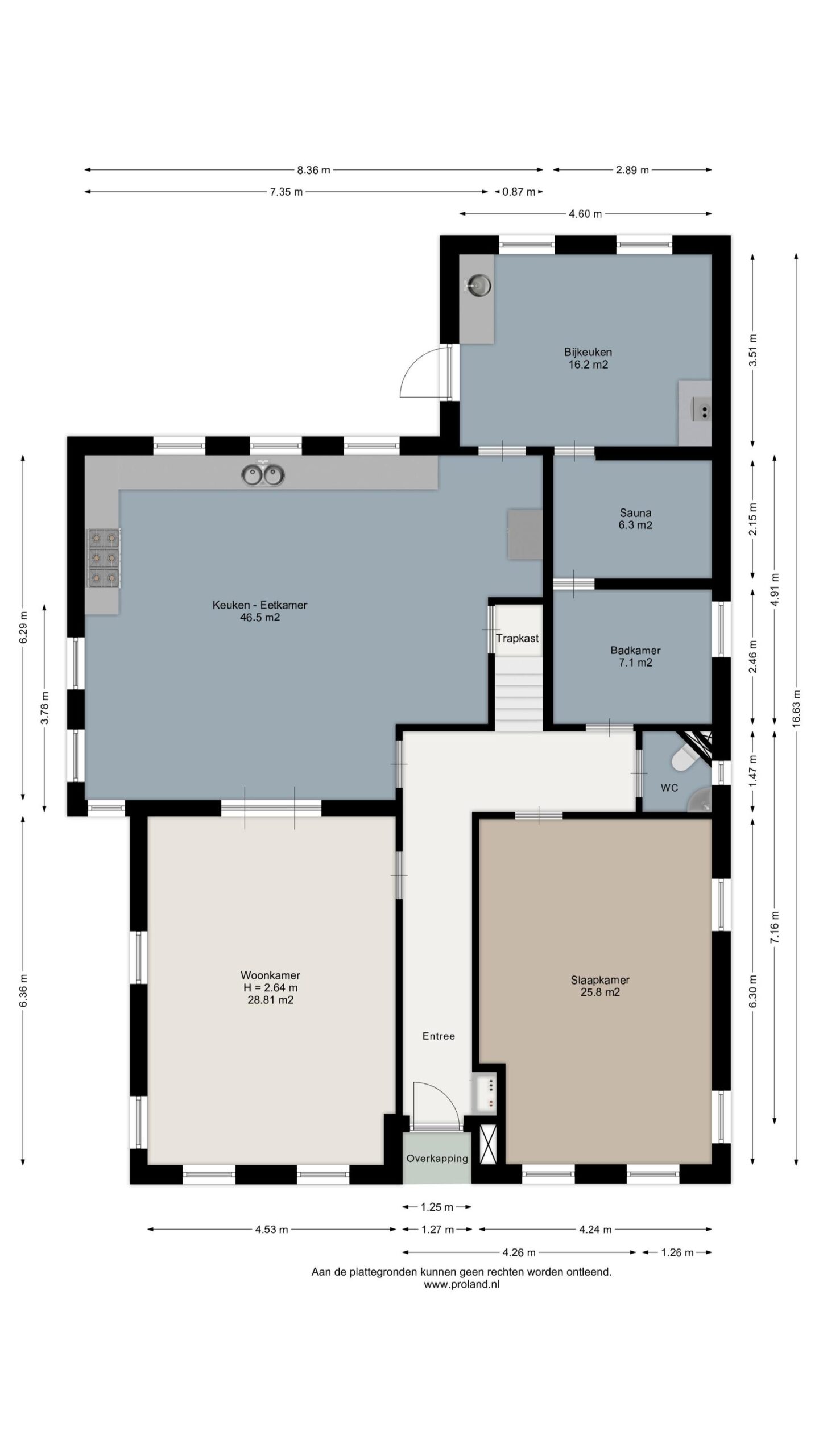 Entree, hal met toegang tot de woonkamer (ca. 29 m²), slaapkamer van ca. 26 m², vervolgens het toilet met fonteintje, badkamer (ca. 7 m²) voorzien van wastafelmeubel en douche, en een heerlijke sauna van ca. 6 m². Vanuit de woonkamer heb je middels prachtige glas-in-lood ensuite deuren toegang tot de woonkeuken. Deze royale woonkeuken van ca. 46 m² is voorzien van een afzuigkap, vaatwasser en een 5 liter close-in boiler. Vanuit de keuken heb je toegang tot de bijkeuken van ca. 16 m² met een keukenblok, wasmachine- en drogeraansluiting en een achterentree. Vanuit de bijkeuken heb je eveneens toegang tot de sauna.