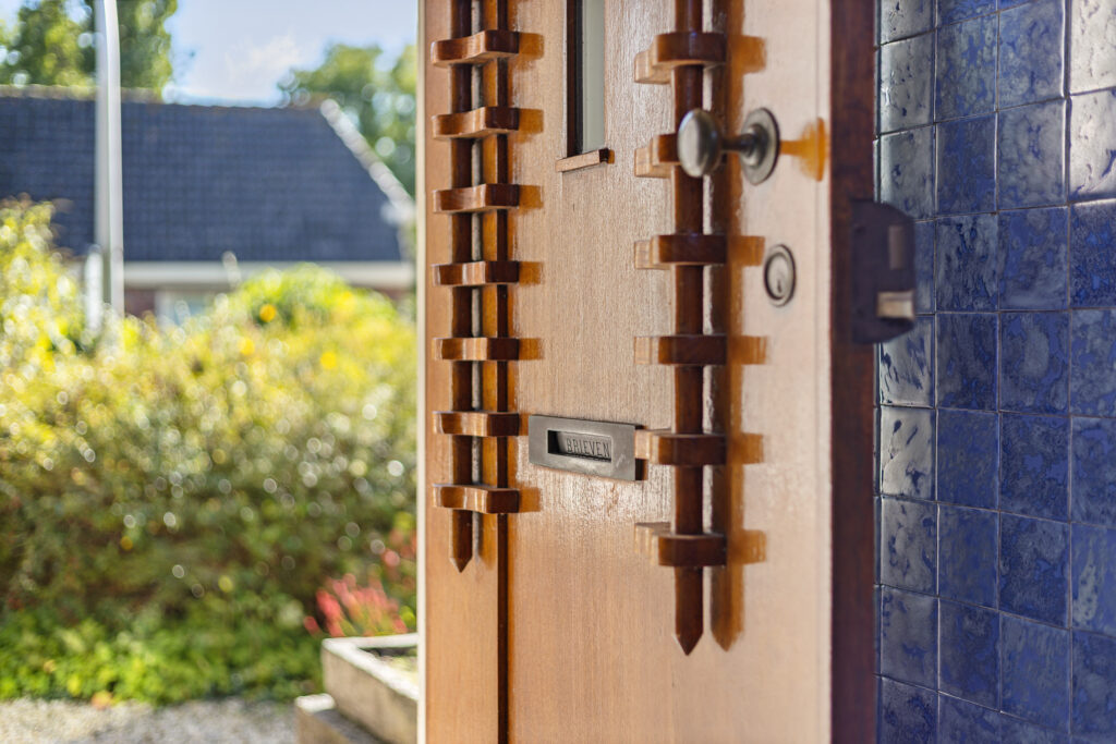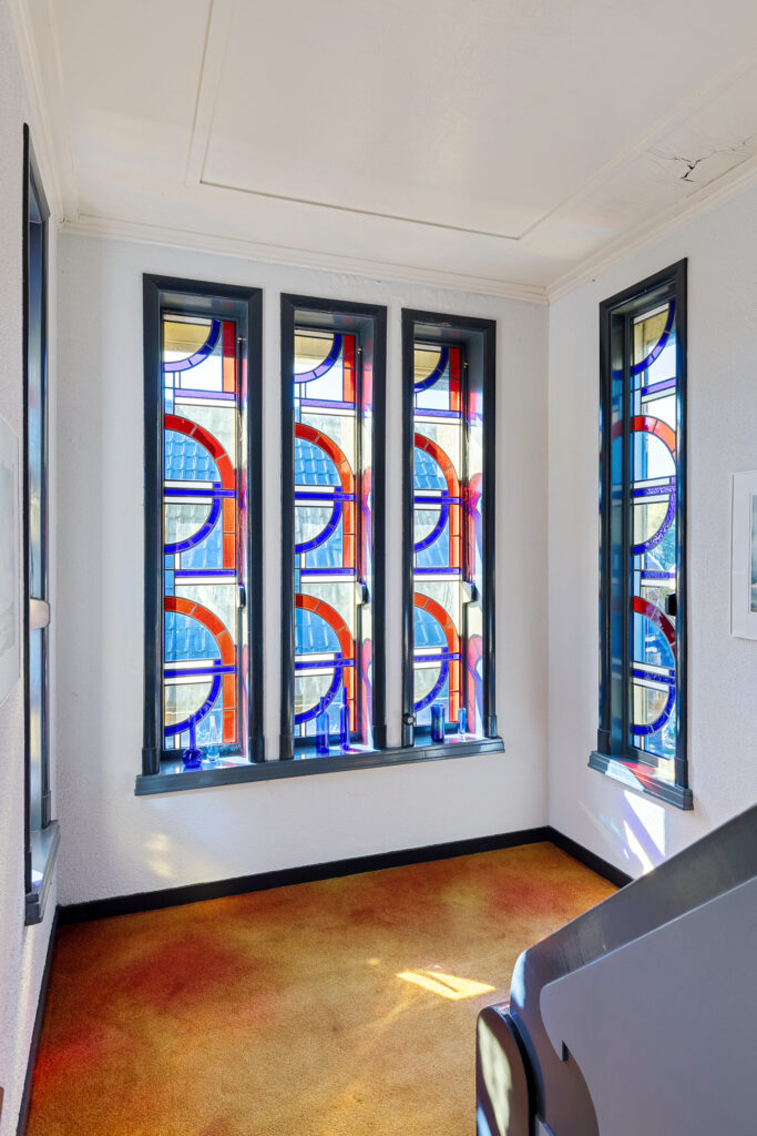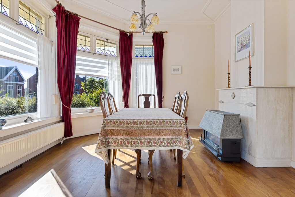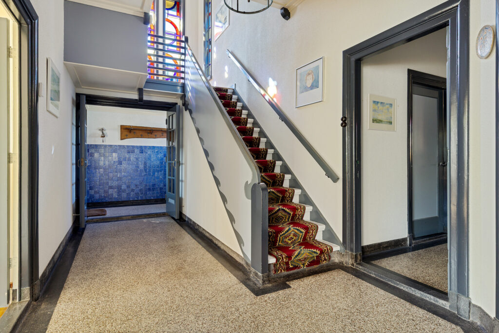 Opvallend aan de indeling is direct de sfeervolle entree bestaande uit een vestibule met onder andere - zoals in het monumentenregister beschreven - ‘een bank van blauwe (gewatteerde) geglazuurde tegels (door timmerman Mulder)’. De aansluitende imposante hal - ook met granitovloer, dubbele tochtdeuren en glas-in-lood ramen - biedt plaats aan de fraaie trapopgang naar de eerste verdieping. Nagenoeg alle vertrekken van het voorhuis zijn rechtstreeks vanuit de hal te betreden. Zoals de woonkamer ‘en suite’ aan de straatzijde bijvoorbeeld, voorzien van originele suitedeuren, bijzondere sierschouwen en fraaie glas-in-lood raampjes. Daarachter een tweede woon- of bijvoorbeeld werk- annex slaapkamer en de dichte eetkeuken met een eenvoudige inrichting en zicht over de achtertuin.