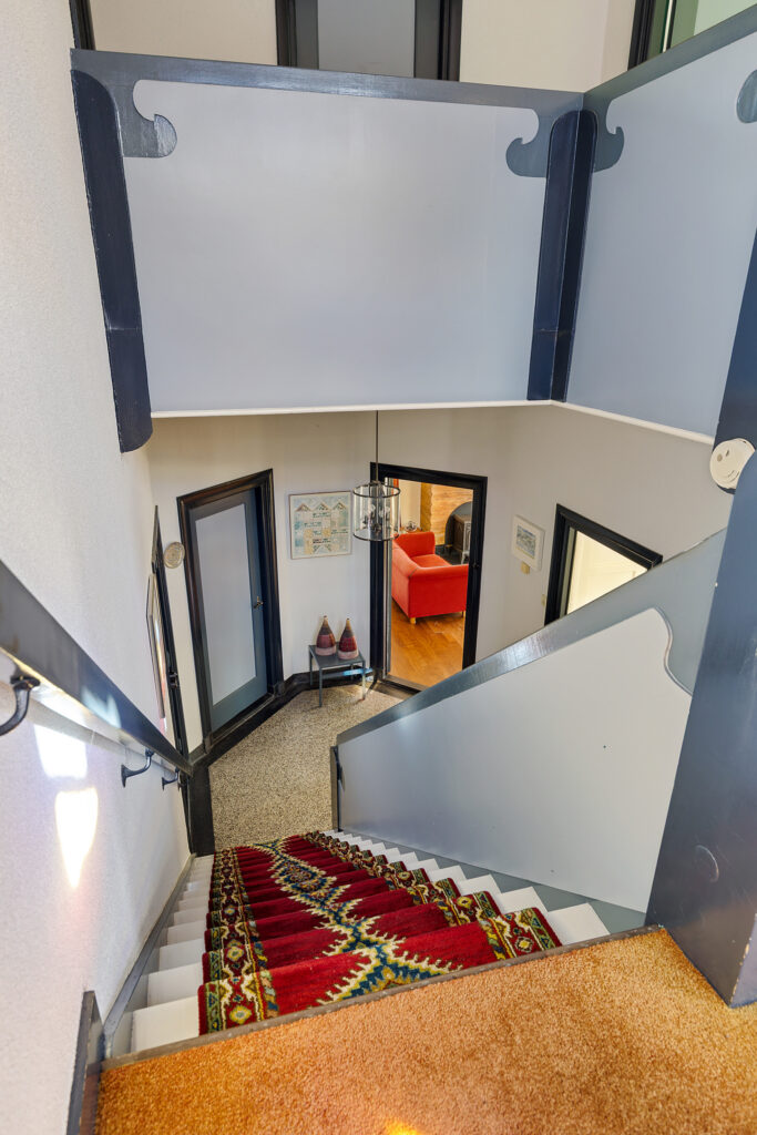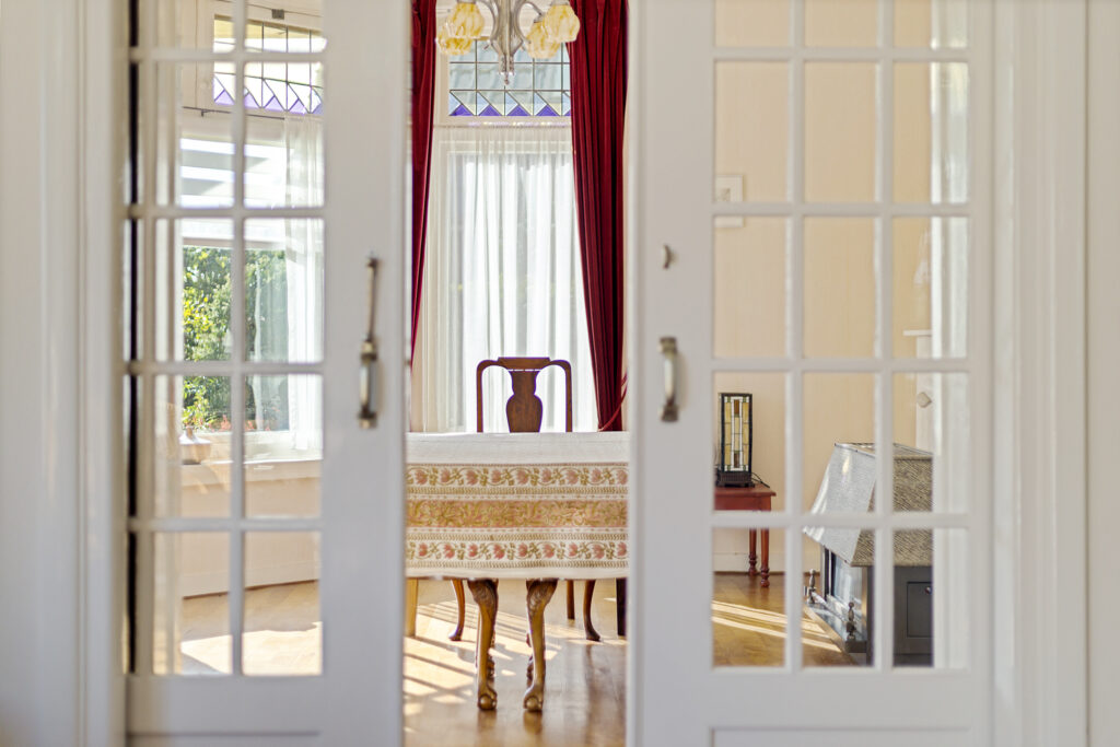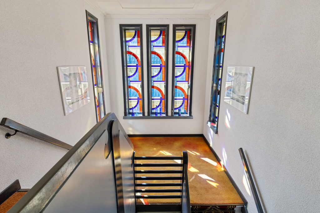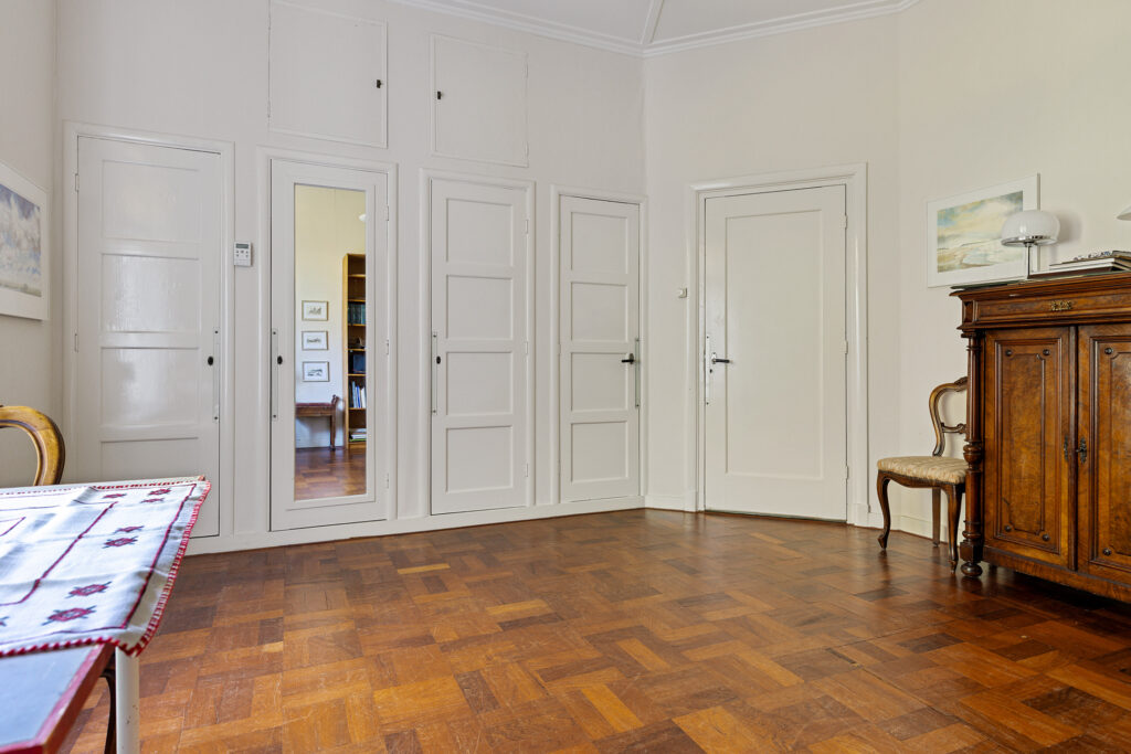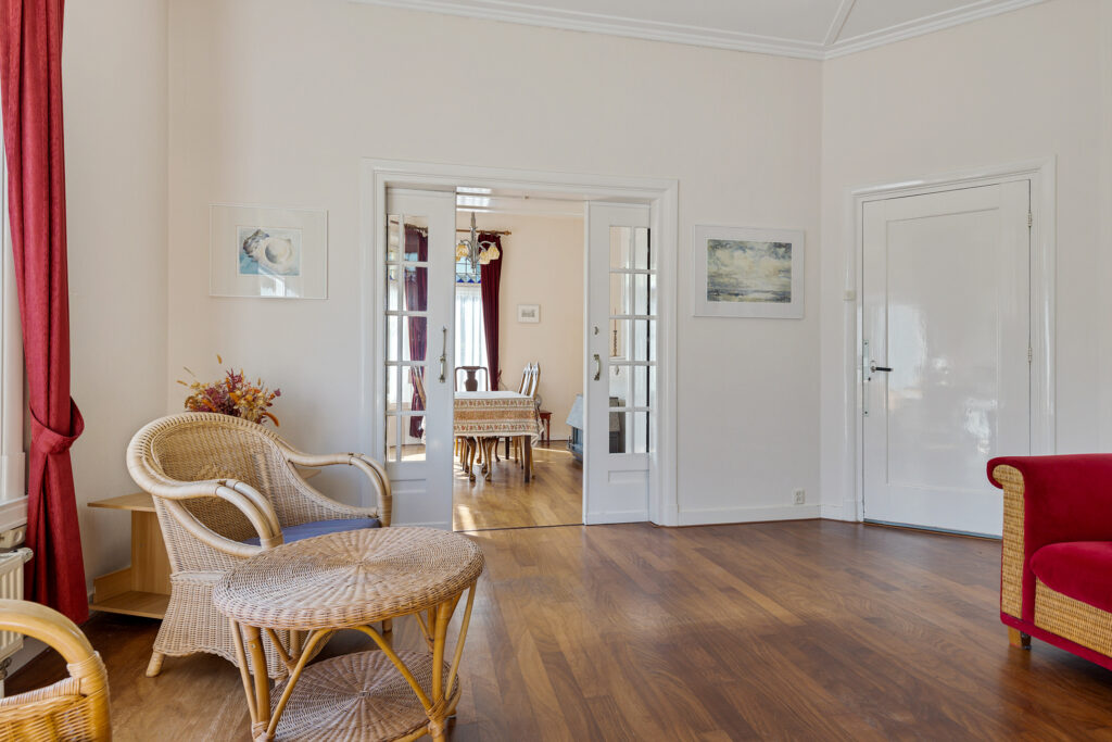 Opvallend aan de indeling is direct de sfeervolle entree bestaande uit een vestibule met onder andere - zoals in het monumentenregister beschreven - ‘een bank van blauwe (gewatteerde) geglazuurde tegels (door timmerman Mulder)’. De aansluitende imposante hal - ook met granitovloer, dubbele tochtdeuren en glas-in-lood ramen - biedt plaats aan de fraaie trapopgang naar de eerste verdieping. Nagenoeg alle vertrekken van het voorhuis zijn rechtstreeks vanuit de hal te betreden. Zoals de woonkamer ‘en suite’ aan de straatzijde bijvoorbeeld, voorzien van originele suitedeuren, bijzondere sierschouwen en fraaie glas-in-lood raampjes. Daarachter een tweede woon- of bijvoorbeeld werk- annex slaapkamer en de dichte eetkeuken met een eenvoudige inrichting en zicht over de achtertuin.