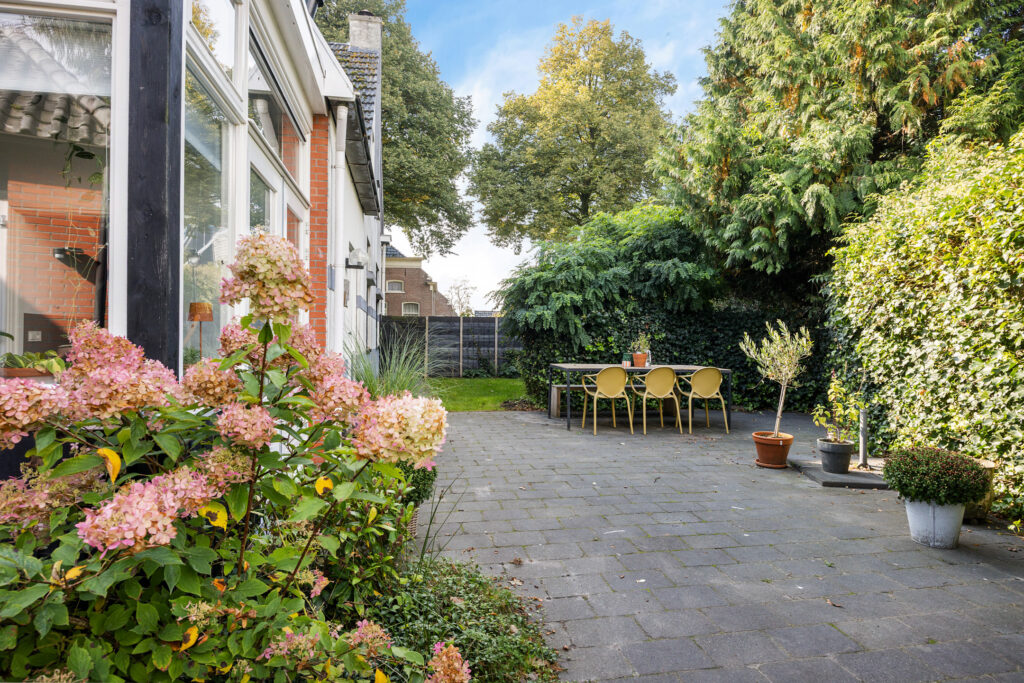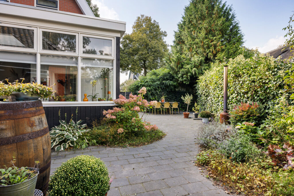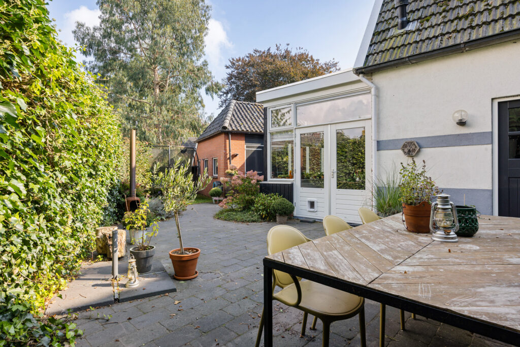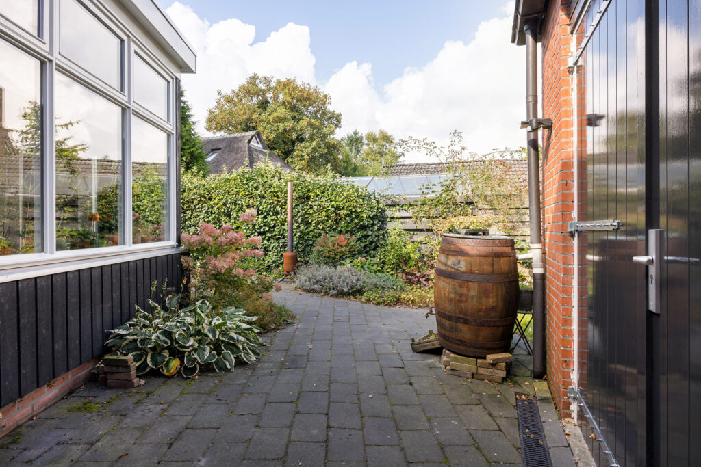 De woning beschikt over een voor-, zij- en achtertuin. De achtertuin biedt veel privacy en is verzorgd aangelegd, met ruimte om te genieten van de zon of juist de schaduw. Achter op het perceel staat een stenen schuur (34 m²) met vliering, perfect voor fietsen, hobby en opslag. De oprit biedt parkeergelegenheid op eigen terrein.