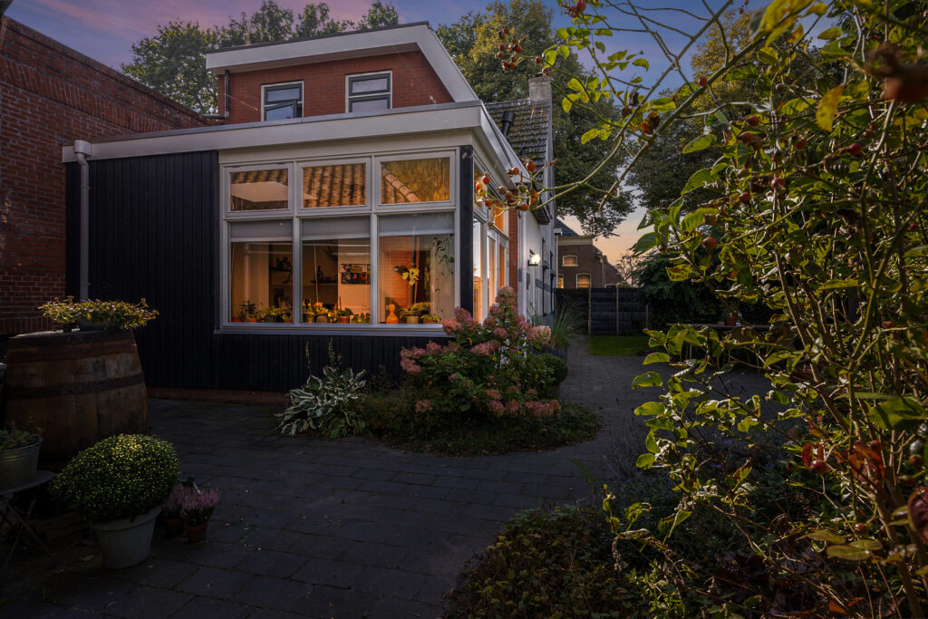 Via de entree komt u in de hal met toegang tot de lichte woonkamer, die dankzij de grote ramen een prettige sfeer heeft. De woonkamer biedt ruimte voor zowel een zit- als een eetgedeelte. De woonkeuken is gesitueerd in de aanbouw (2020) die ruim is opgezet en voorzien van openslaande deuren naar de tuin, waardoor binnen en buiten mooi in elkaar overlopen. Verder vindt u op de begane grond een bijkeuken, toilet en diverse praktische bergruimten.