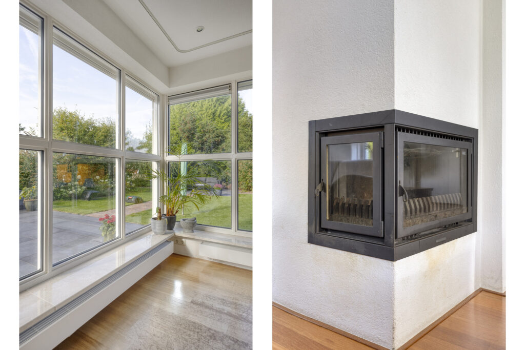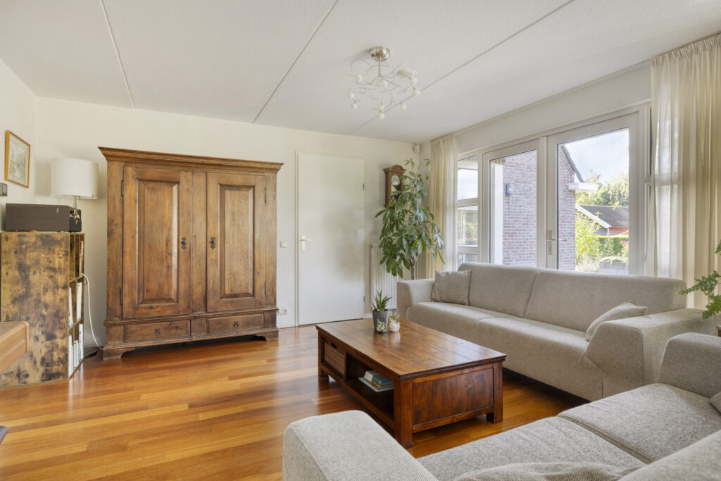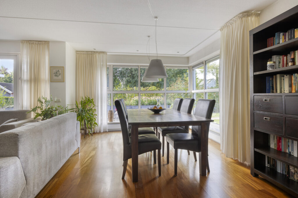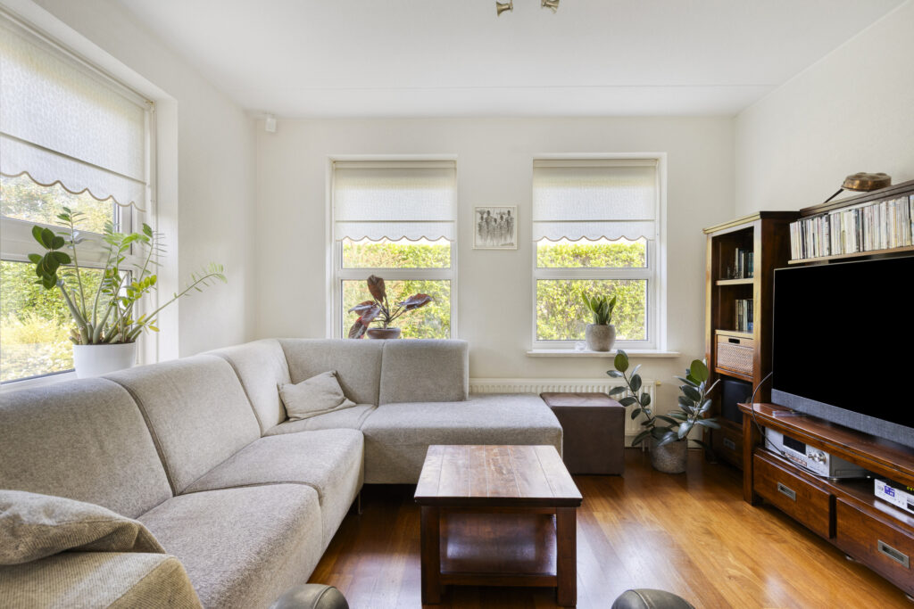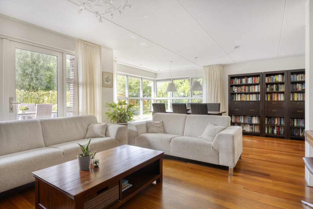 - woonkamer met veel lichtinval en twee zithoeken;