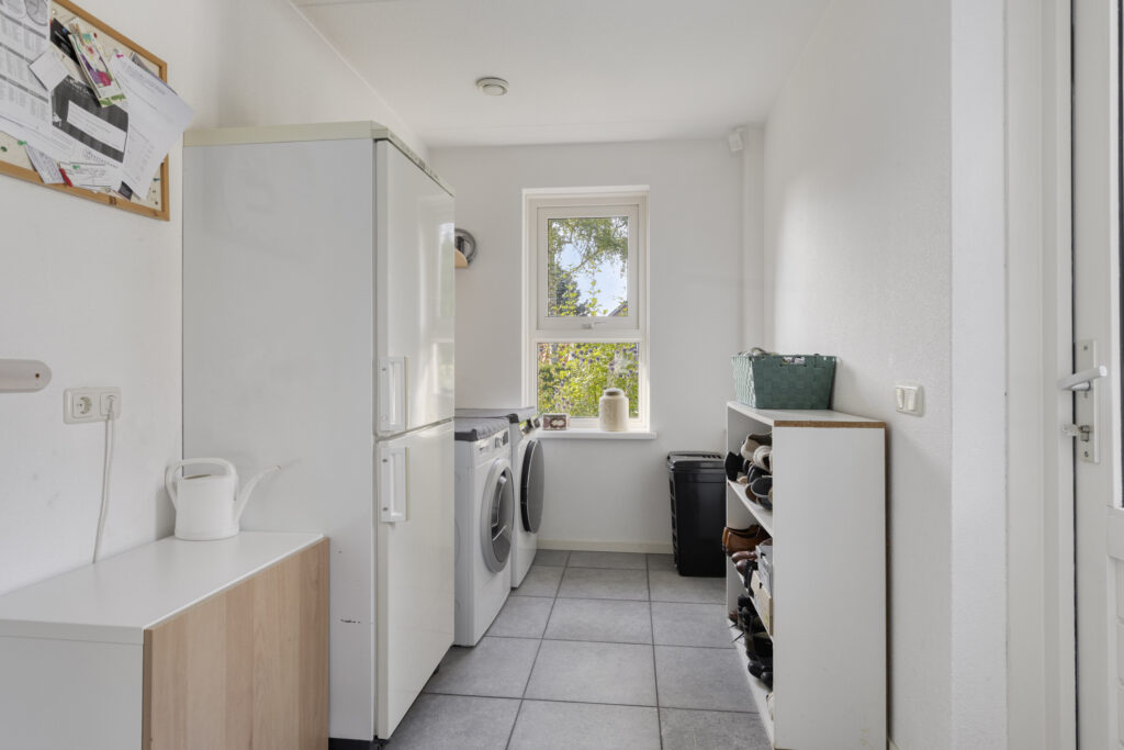 Indeling: entree; hal met toilet en trapopgang; slaap-/of werkkamer; badkamer met douche en wastafel; royale L-vormige tuingerichte woonkamer met terrasdeuren en haard; woonkeuken met keuken in hoekopstelling die voorzien is van inductiekookplaat, afzuigkap, vaatwasser, koelkast, vriezer, magnetron en oven; bijkeuken met achterentree en witgoedaansluitingen; dubbele garage met elektrische deuren.