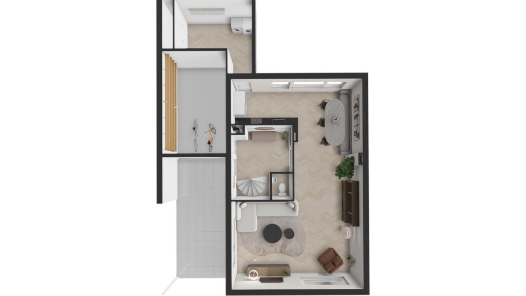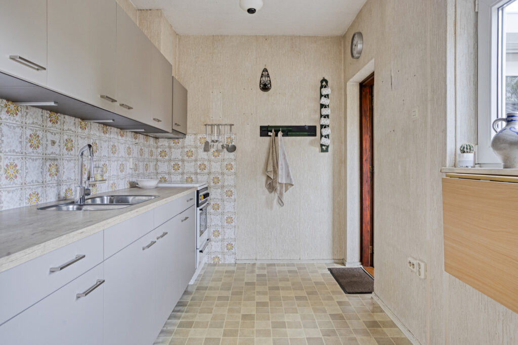 Indeling: entree; hal met trapopgang, entree garage en toilet; straatgerichte woonkamer; gesloten keuken met moderne keukenopstelling; bijkeuken met achterentree.