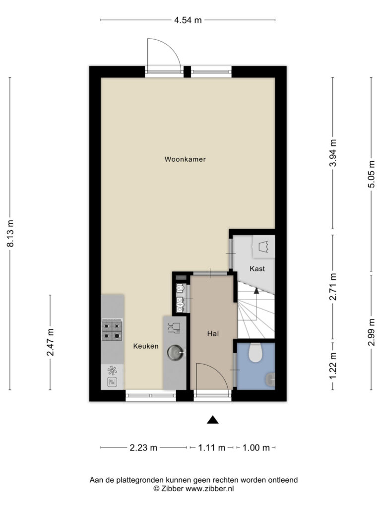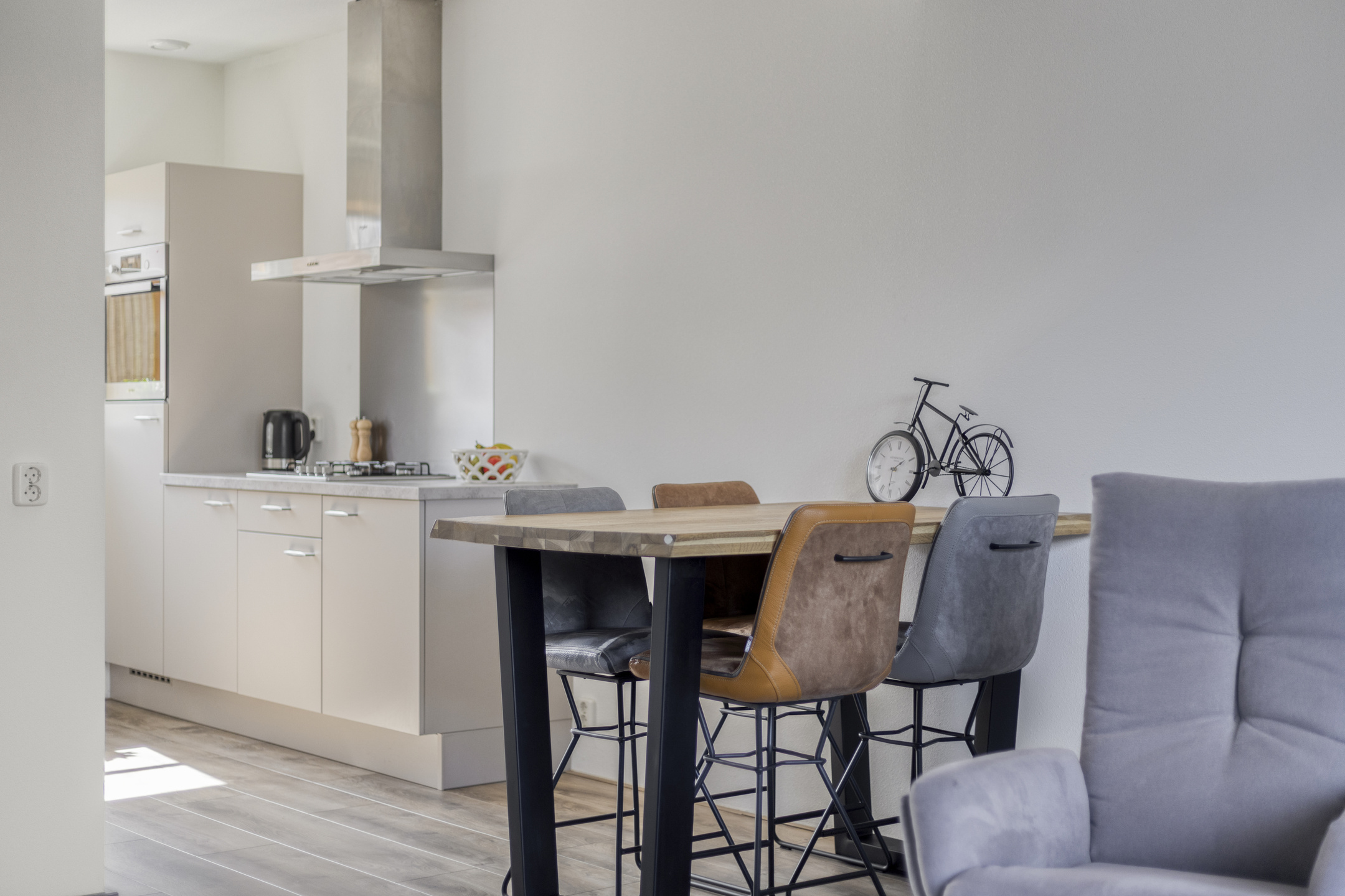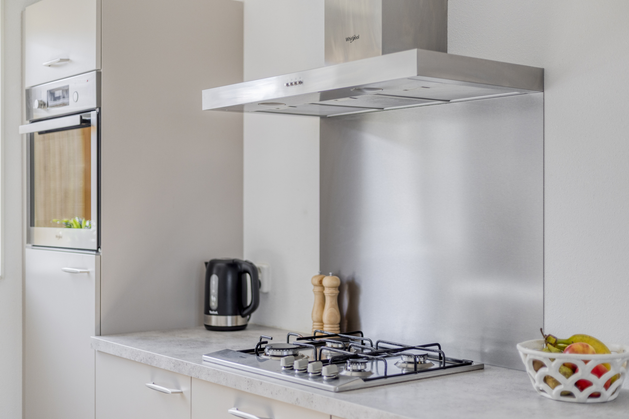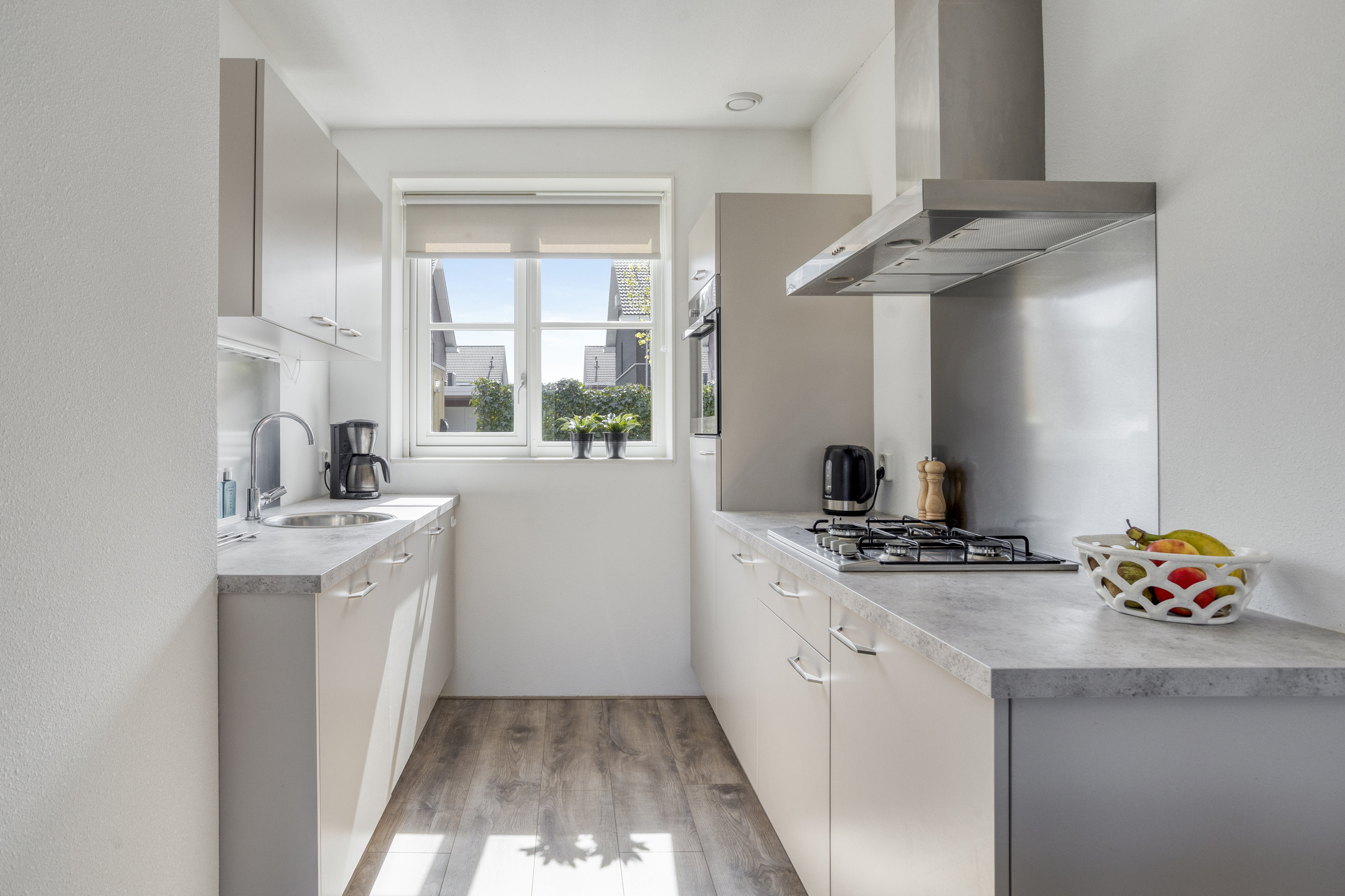 Indeling: entree/hal; toilet met fontein; tuingerichte woonkamer met trapkast en tuindeur naar het terras; eigentijdse open keuken die voorzien is van een gasfornuis, afzuigkap, vaatwasser, koelkast en oven.