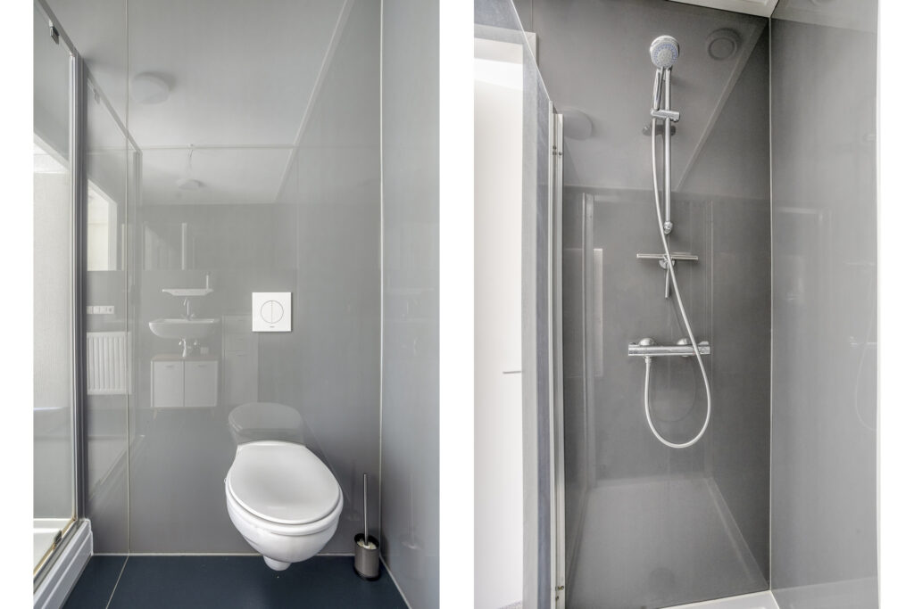 Eerste verdieping: overloop; twee slaapkamers; badkamer met een douche, wastafel en toilet.