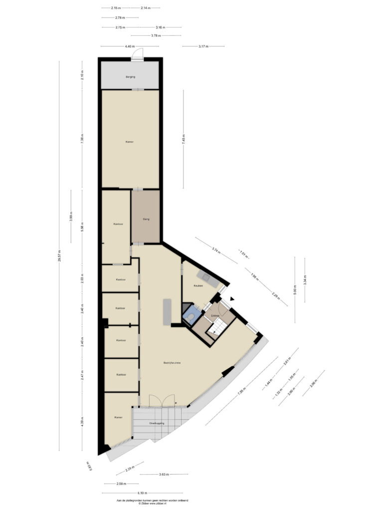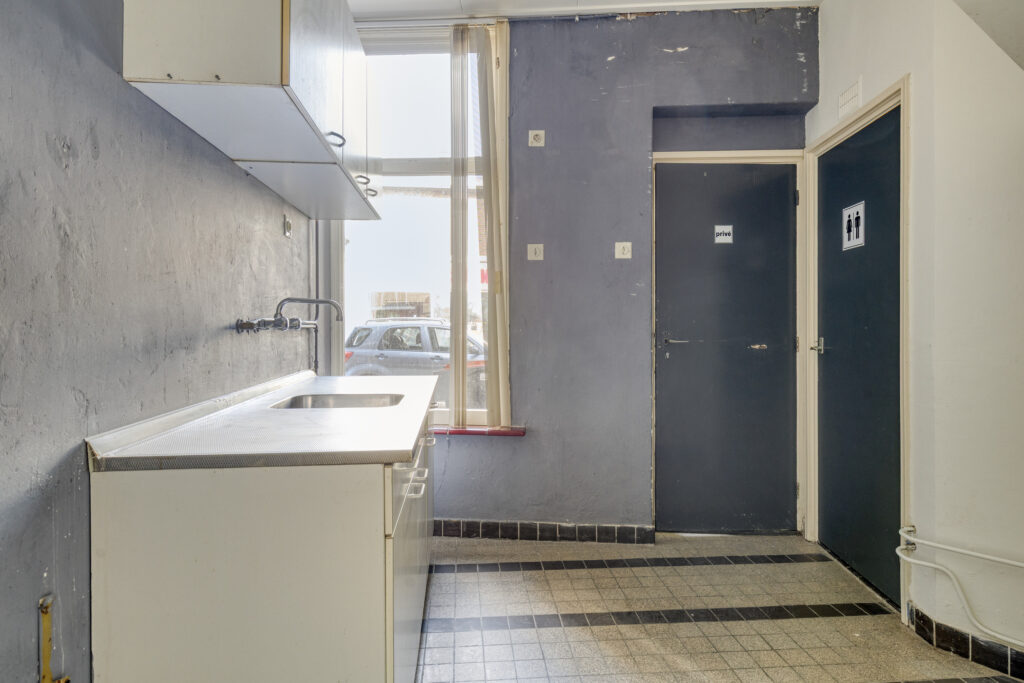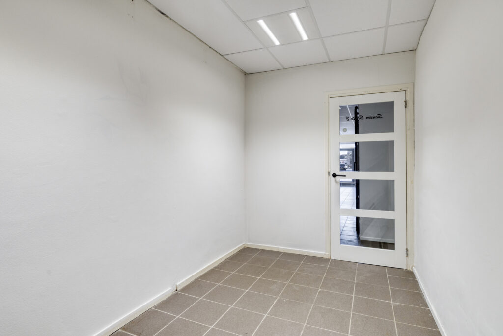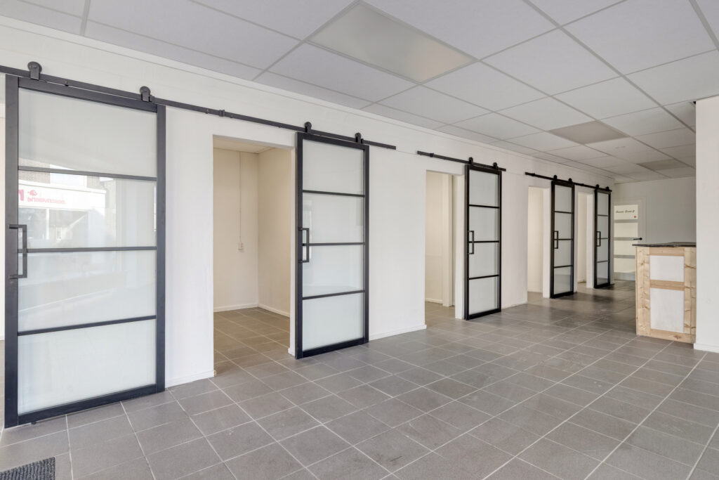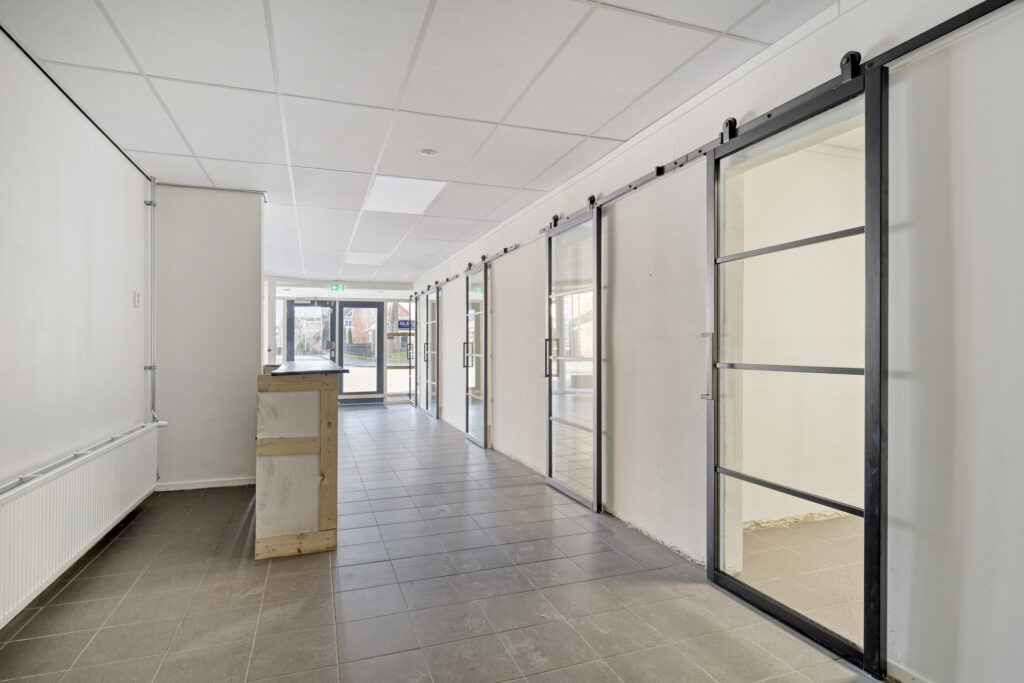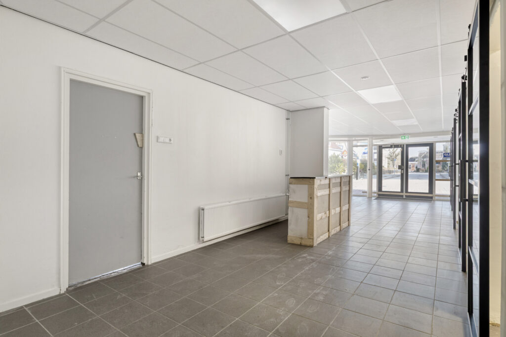 Bedrijfsruimte begane grond: showroom/winkelruimte; zes afgescheiden "praktijkruimtes' (eenvoudige opnieuw in te delen); achterhal; bergingsruimte met achterentree; grenzend aan de bedrijfsruimte is een keuken met keukenblok en toilet aanwezig.