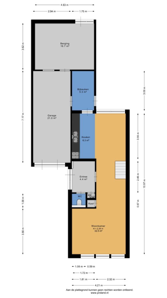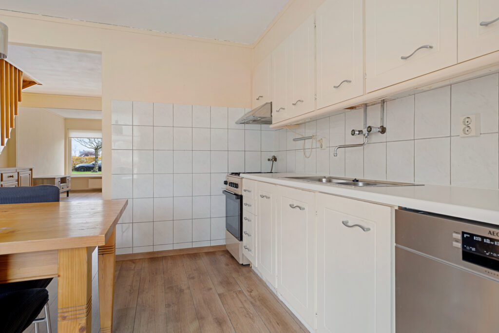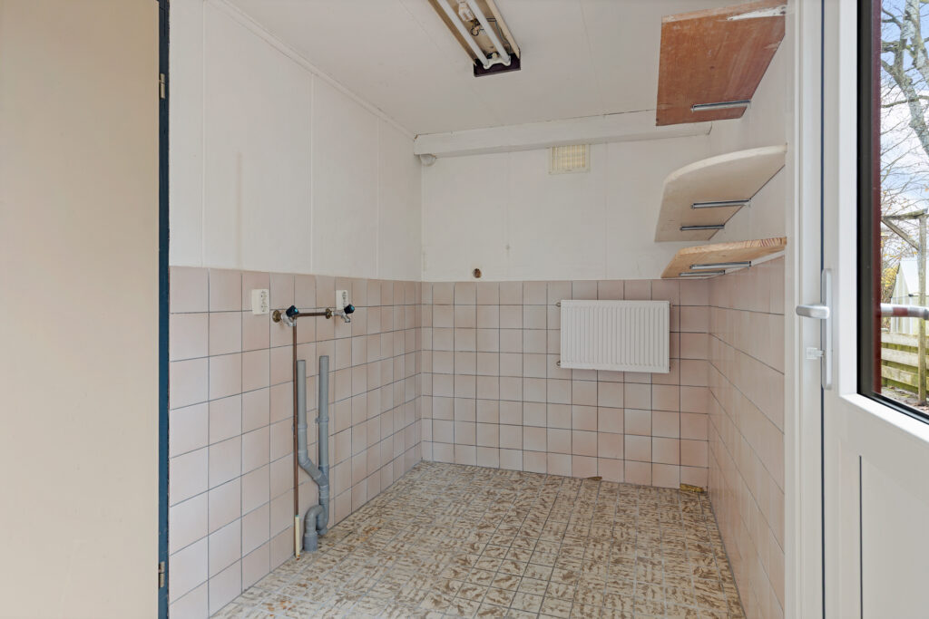 Entree/hal met modern toilet en meterkast, L-vormige woonkamer (ca. 32,5 m²), half open keuken (ca. 6,5 m²; met keukenblok voorzien van vaatwasser, fornuis met oven, 4-pits gaskookplaat en een afzuigkap), aangrenzende bijkeuken (ca. 5,5 m²) met achterdeur en doorgang naar de aangebouwde garage (ca. 21 m²) met doorgang naar de aangebouwde berging (ca. 16,5 m²; met achterdeur).