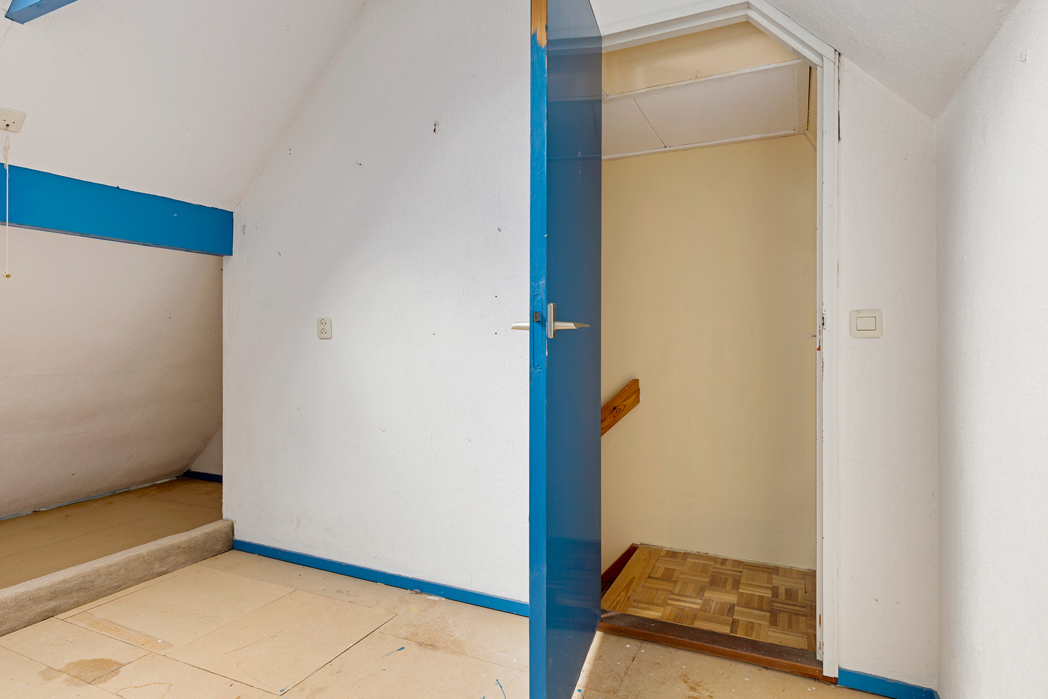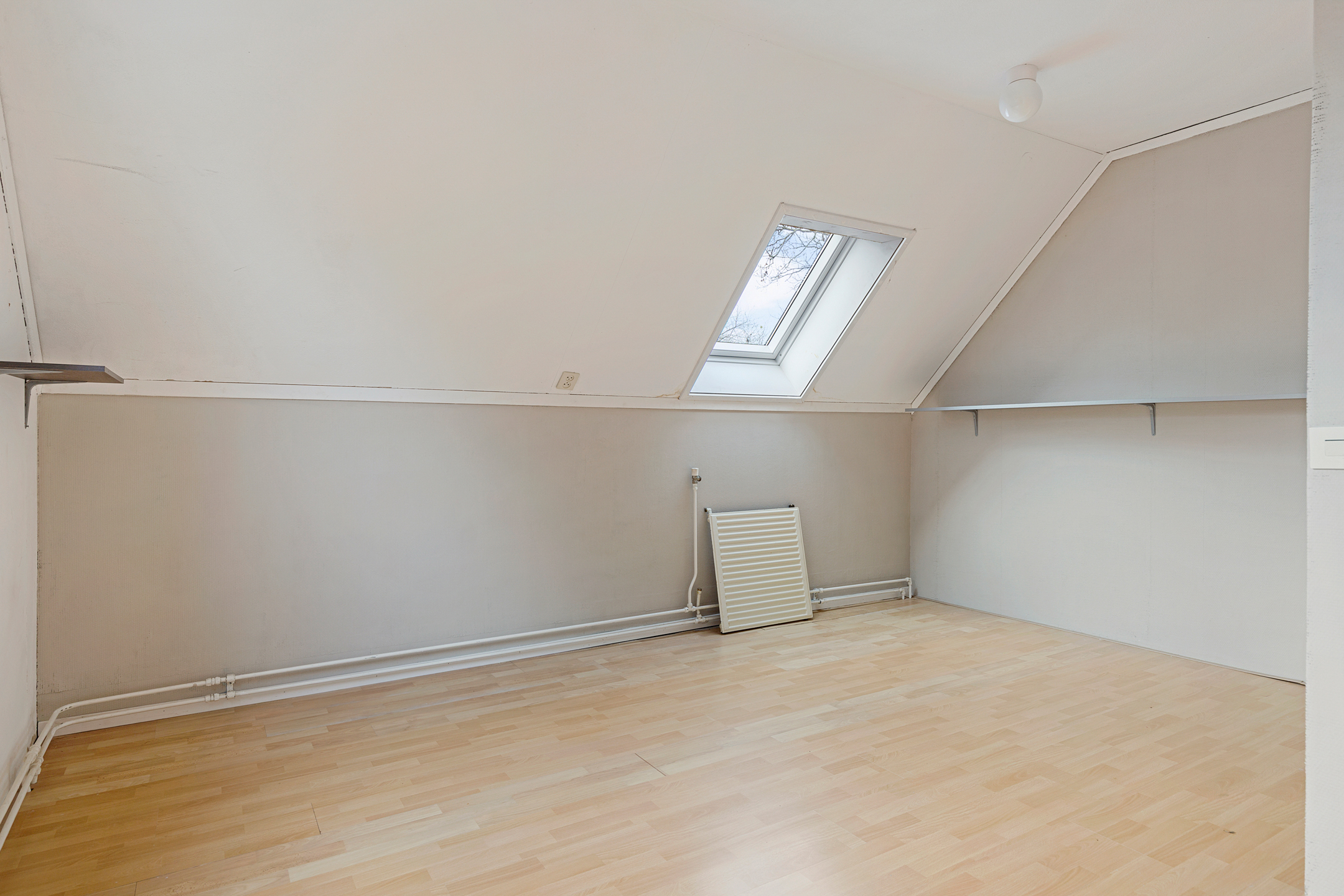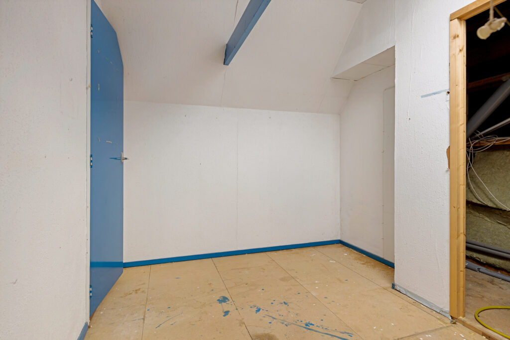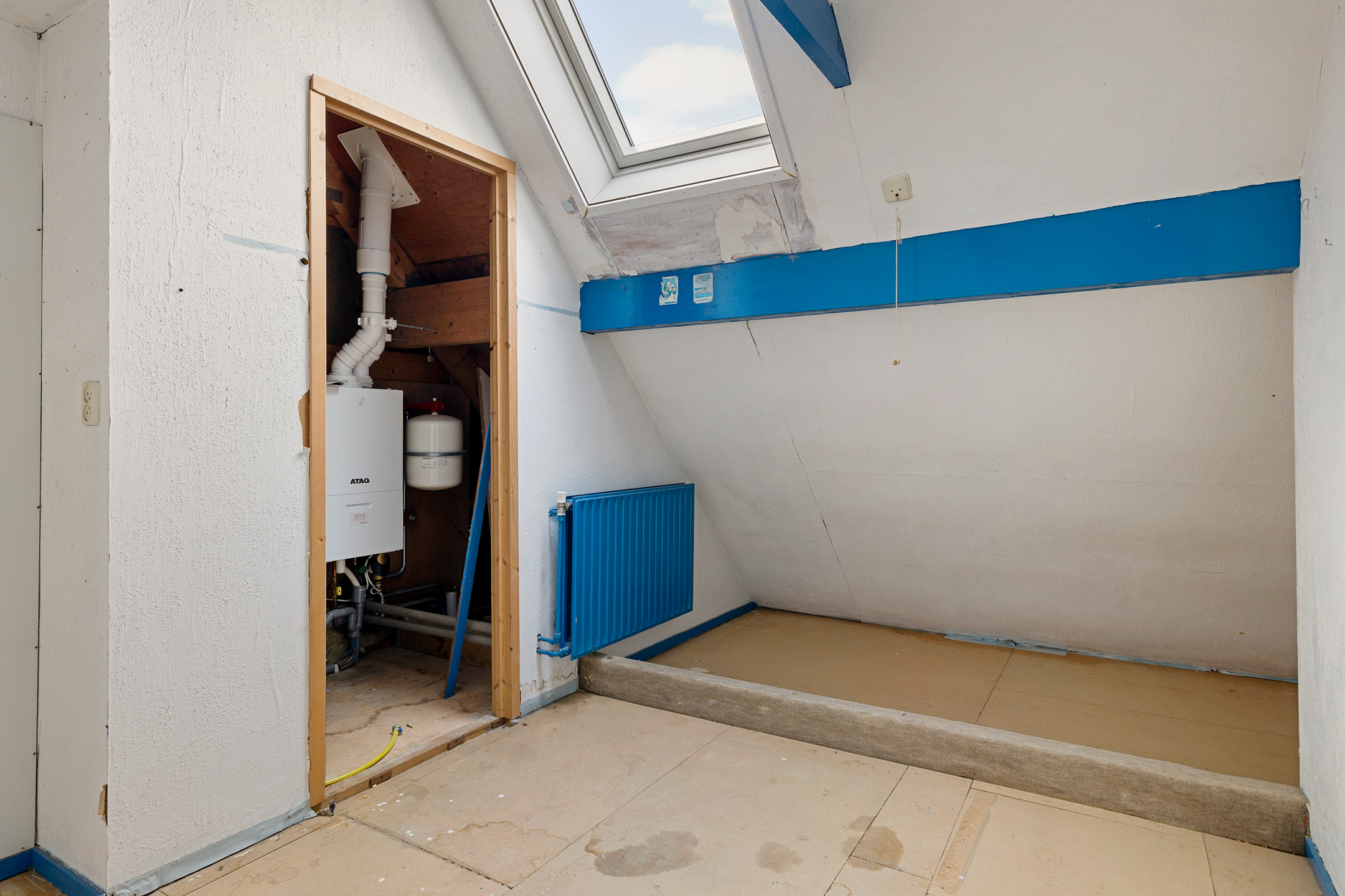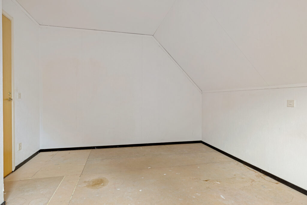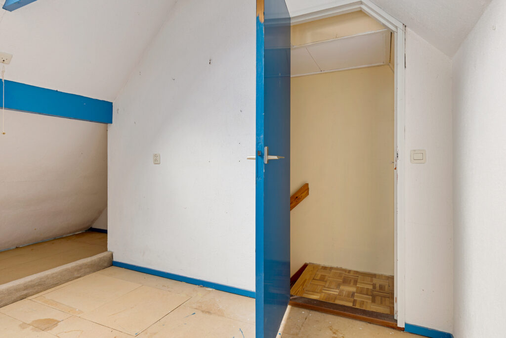 Middels vaste trap te bereiken overloopje met bergruimte achter de knieschotten en aangrenzende zolderkamer (ca. 7 m²) met stookruimte (ca. 2,5 m²).