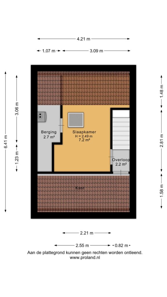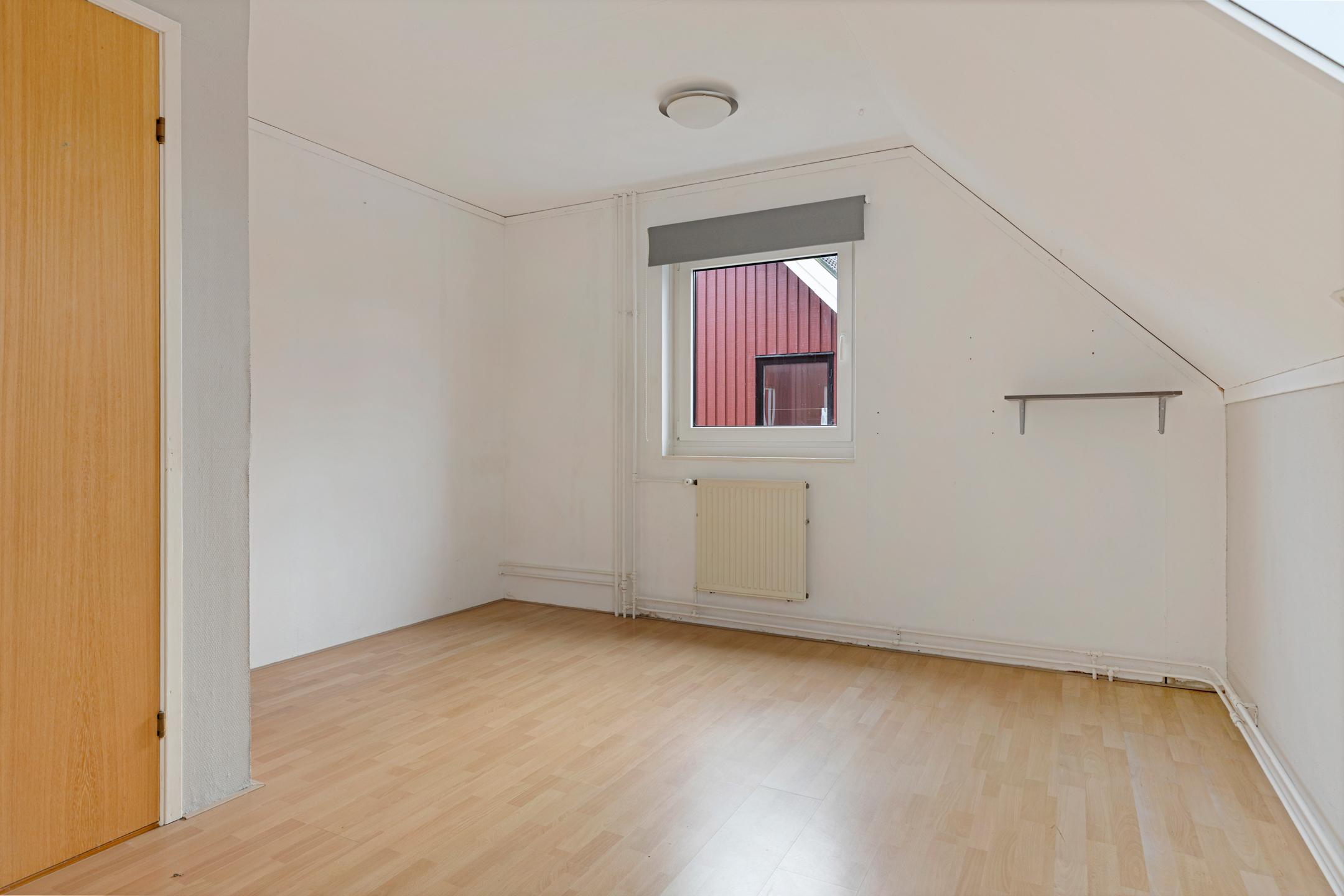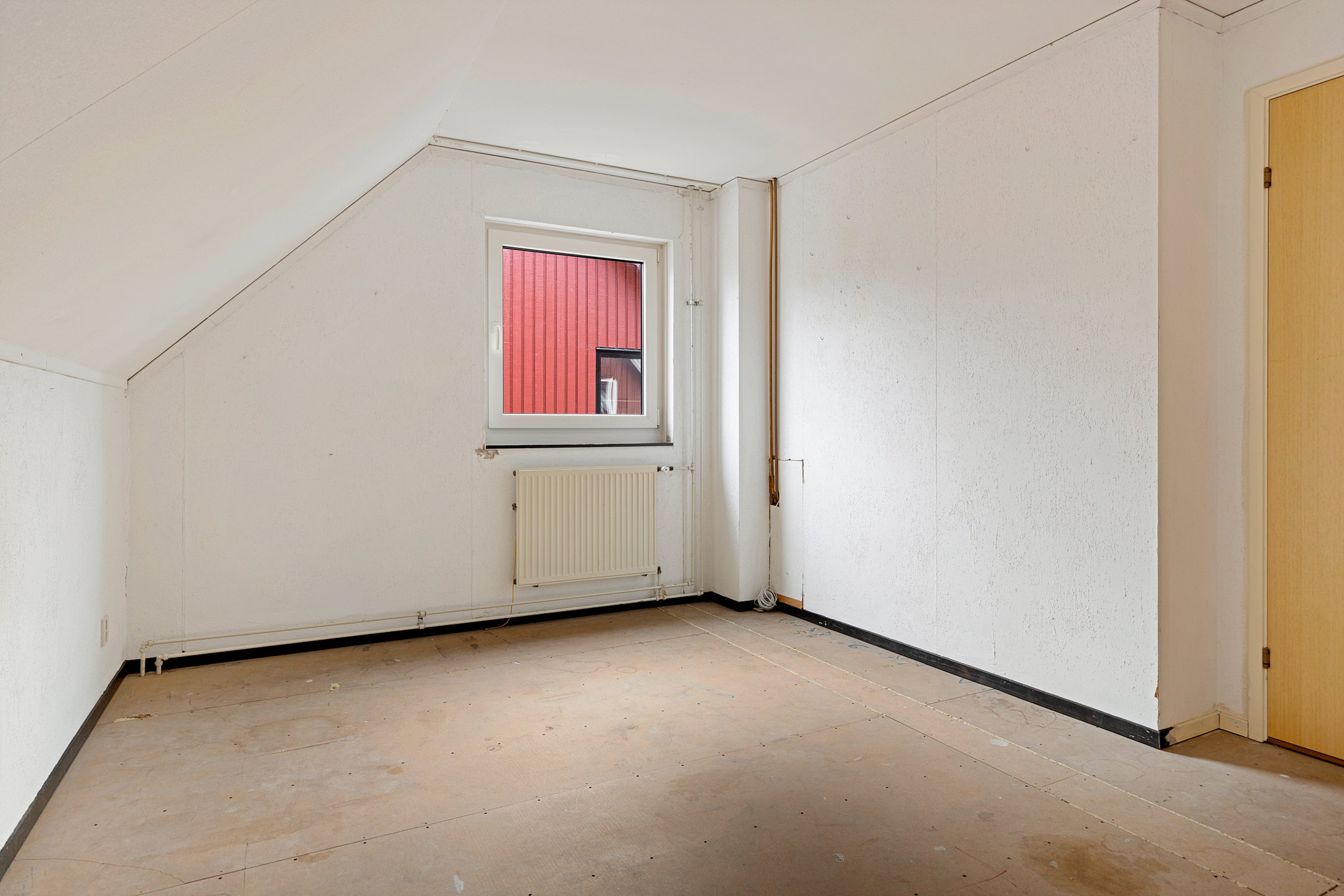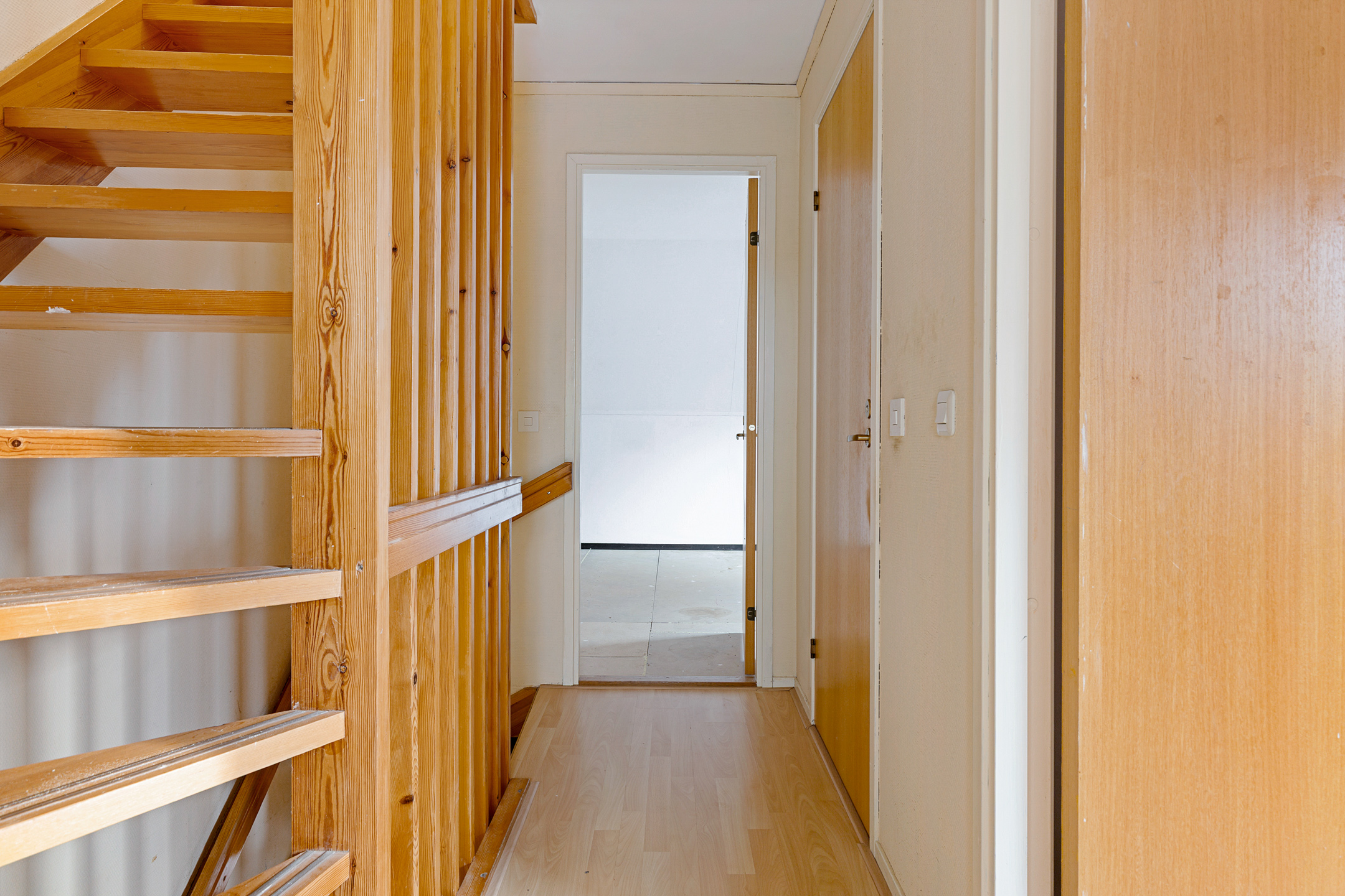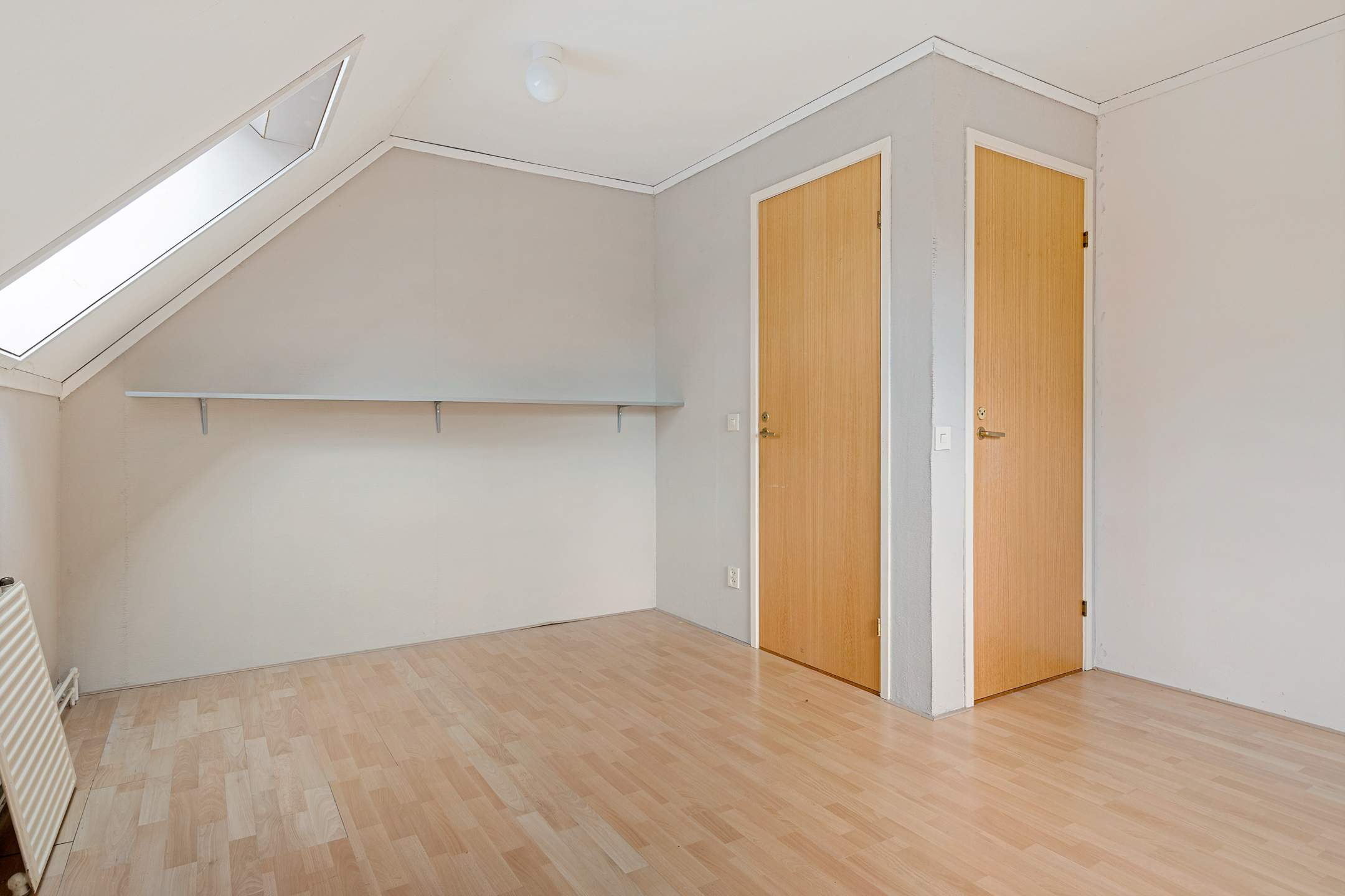 Middels vaste trap te bereiken overloopje met bergruimte achter de knieschotten en aangrenzende zolderkamer (ca. 7 m²) met stookruimte (ca. 2,5 m²).