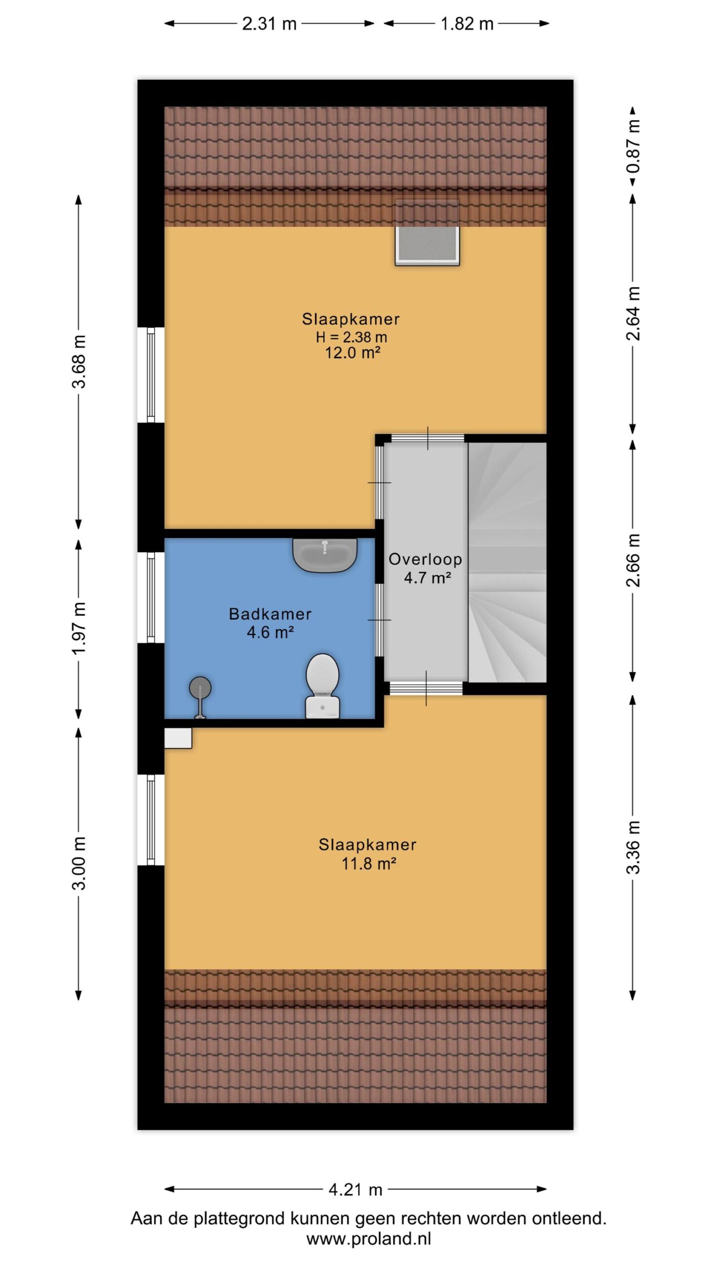 Middels vaste trap te bereiken overloop met trapopgang naar de zolderverdieping en aangrenzend slaapkamer (ca. 12 m²), badkamer (ca. 4,5 m²; met douchehoek, toilet en wastafel) en slaapkamer (ca. 12 m²).