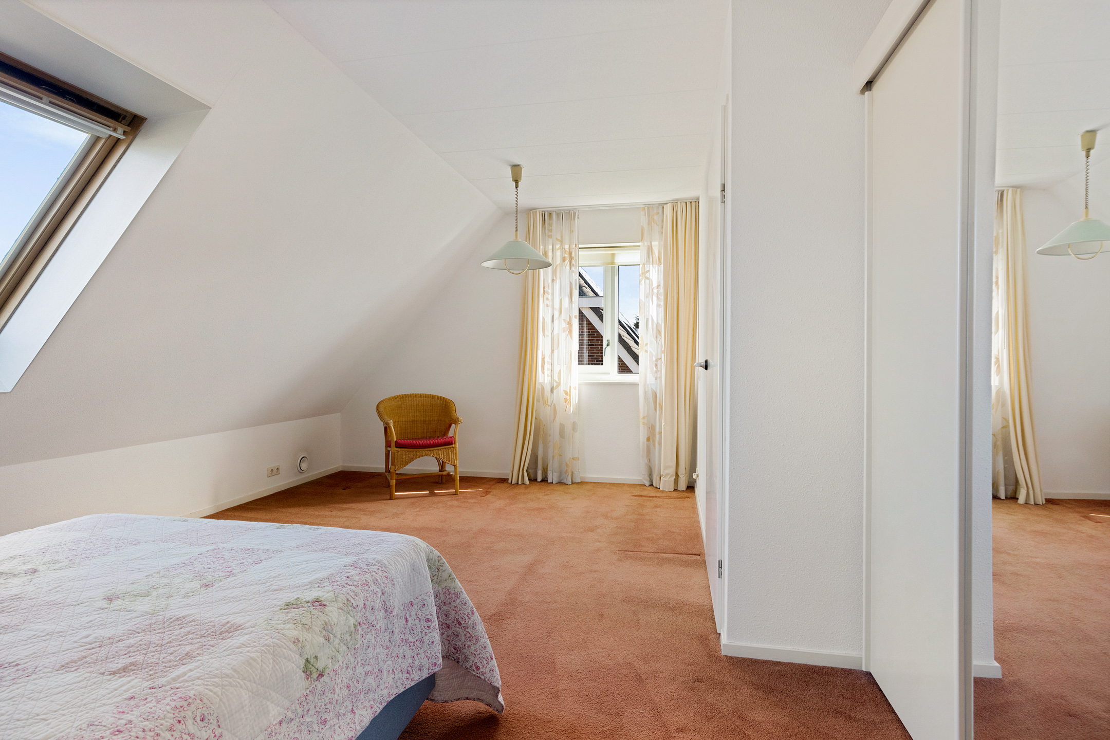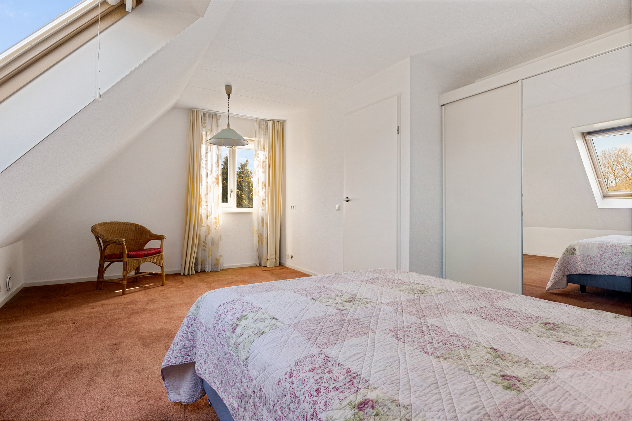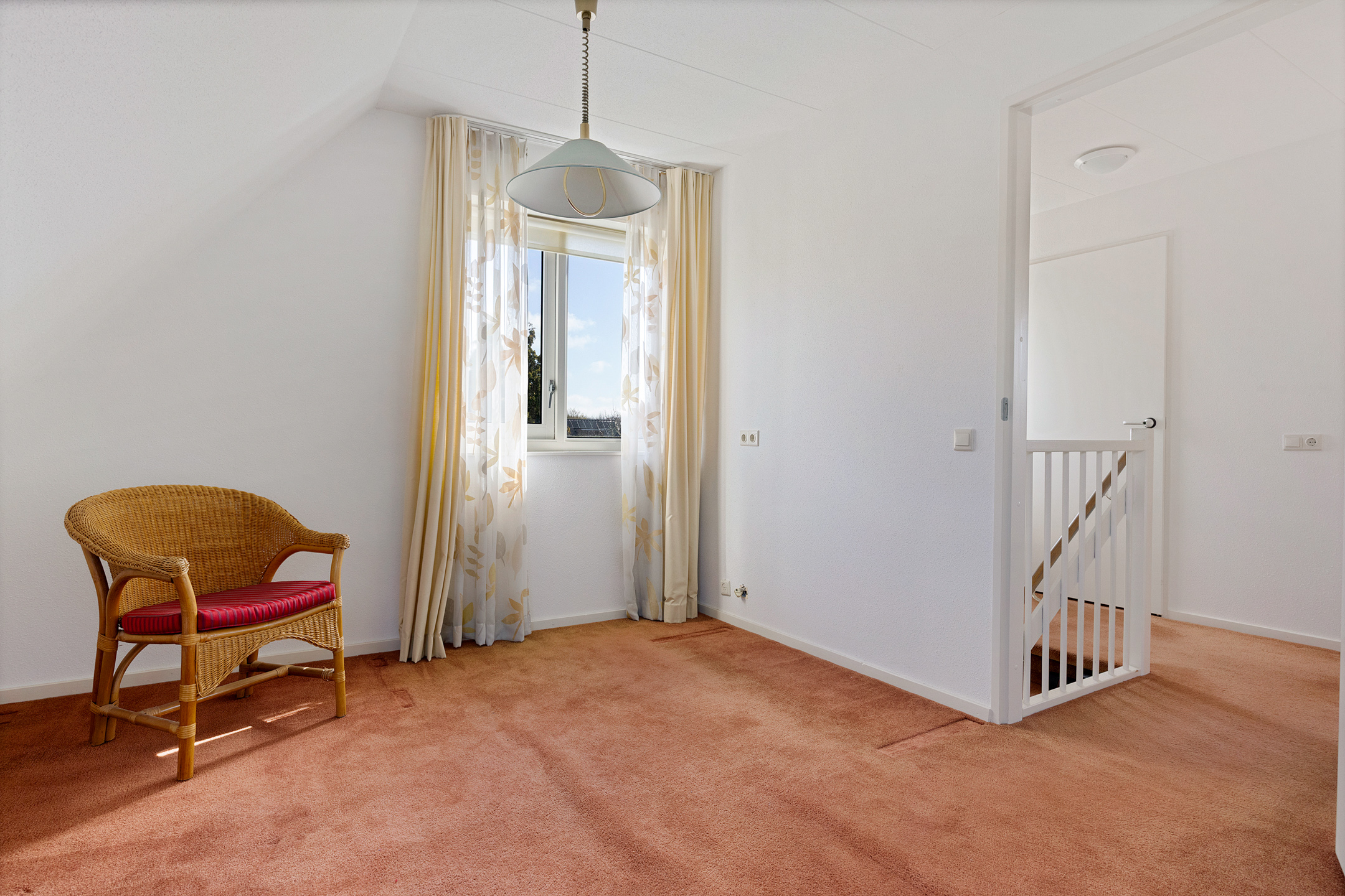 Middels een overloop op de verdieping toegang tot 2 slaapkamers van ca. 9 en 18 m² en een badkamer met ligbad, douchecabine, wastafel en een tweede toilet. Via een vaste trap op de overloop kom je op de zolderruimte.