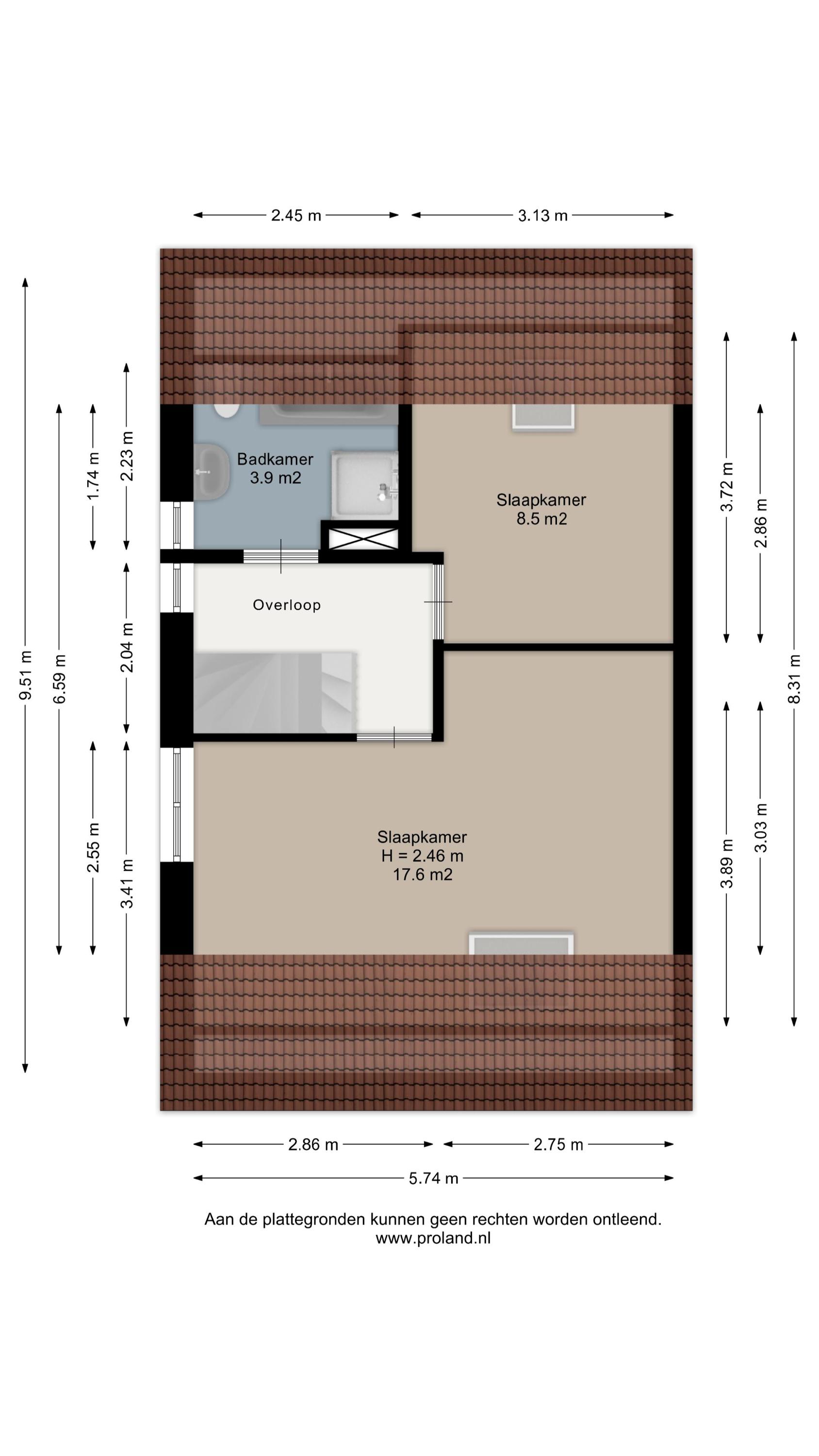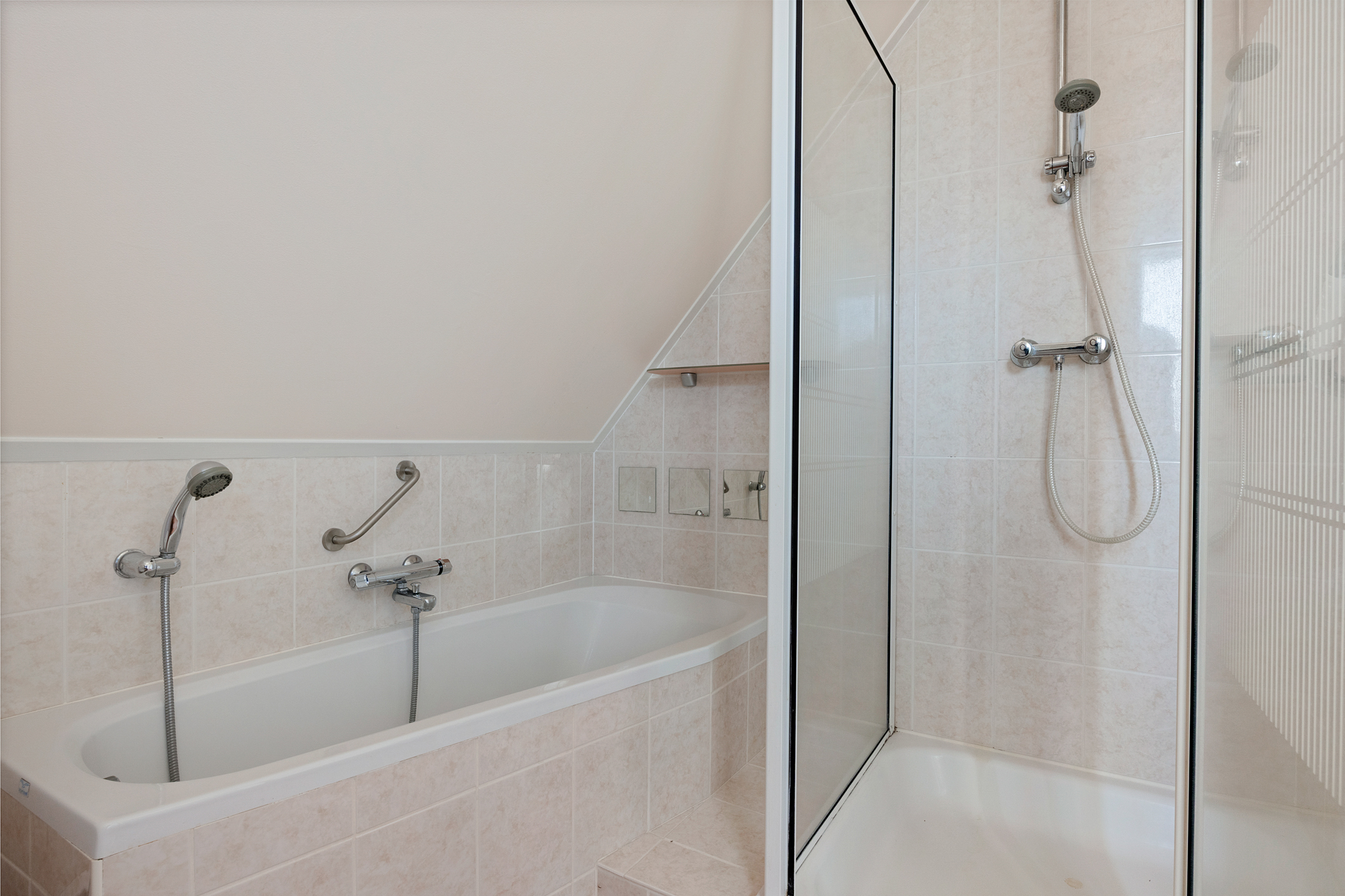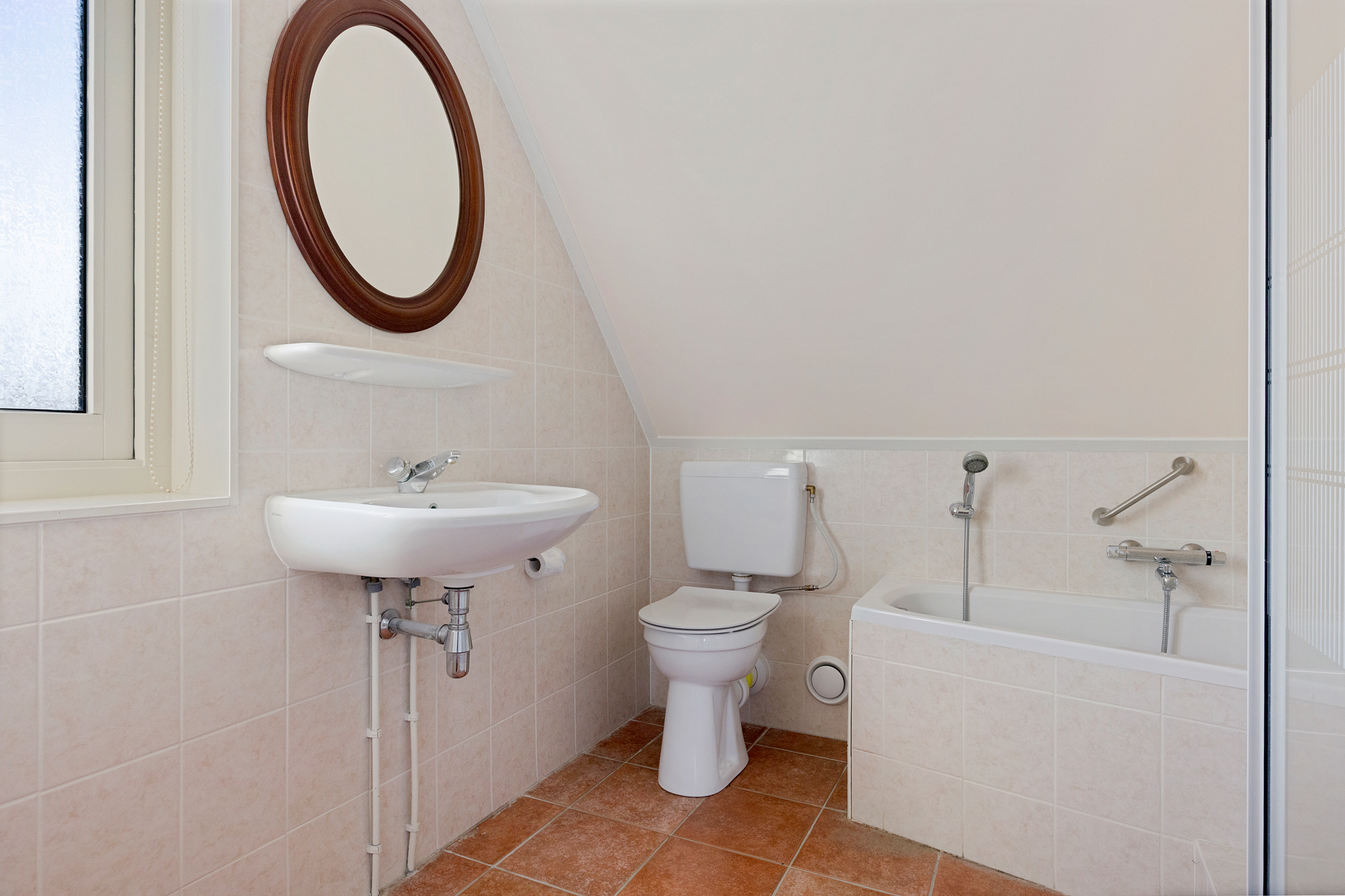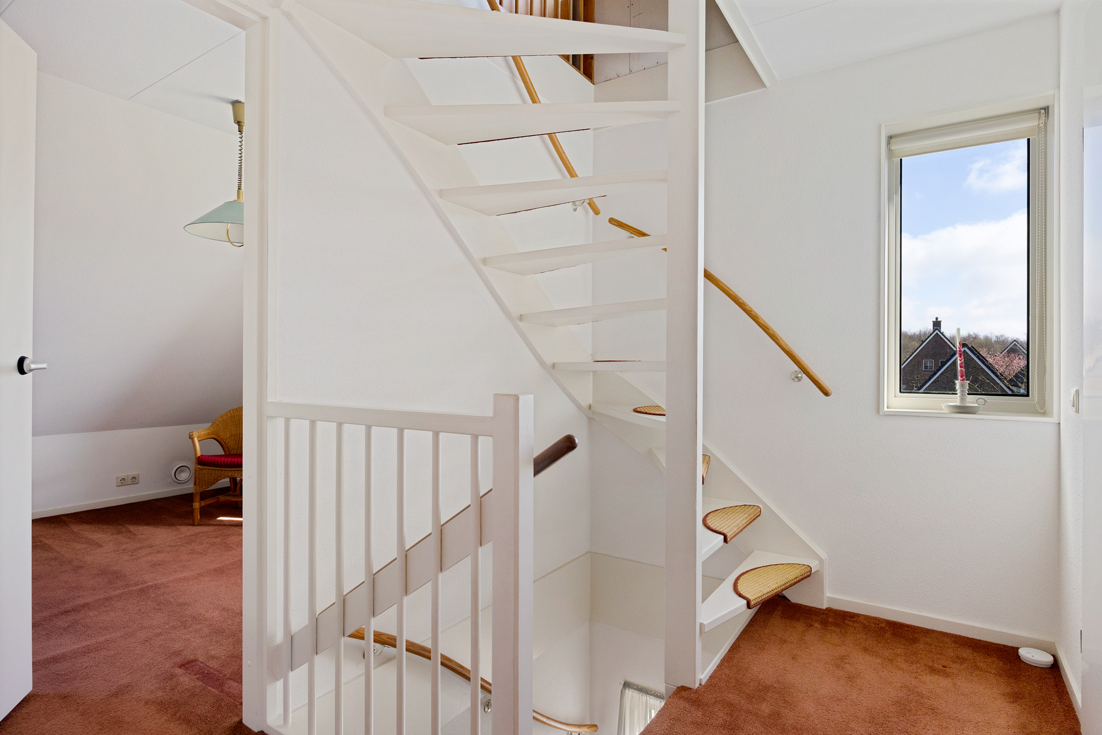 Middels een overloop op de verdieping toegang tot 2 slaapkamers van ca. 9 en 18 m² en een badkamer met ligbad, douchecabine, wastafel en een tweede toilet. Via een vaste trap op de overloop kom je op de zolderruimte.