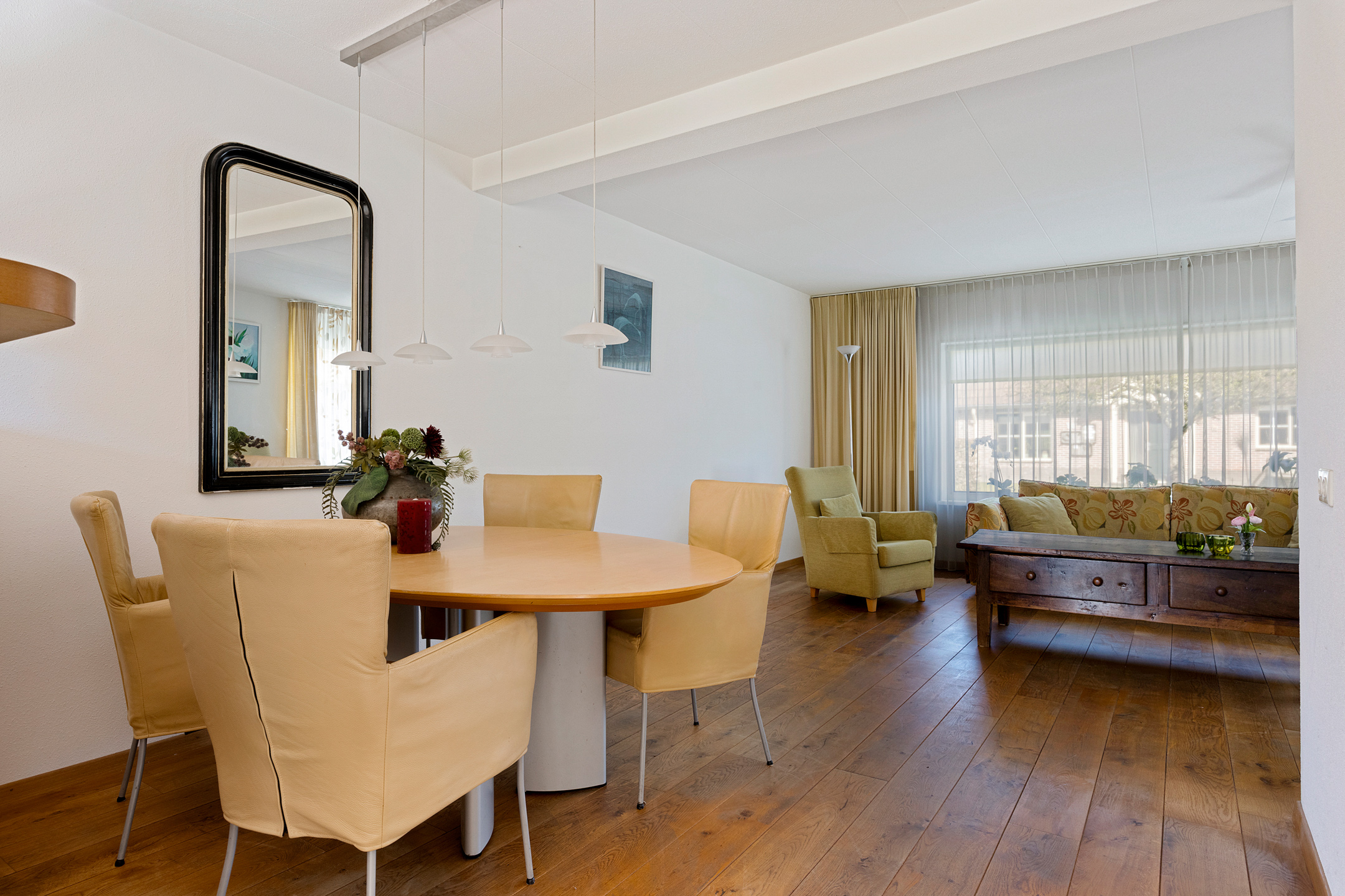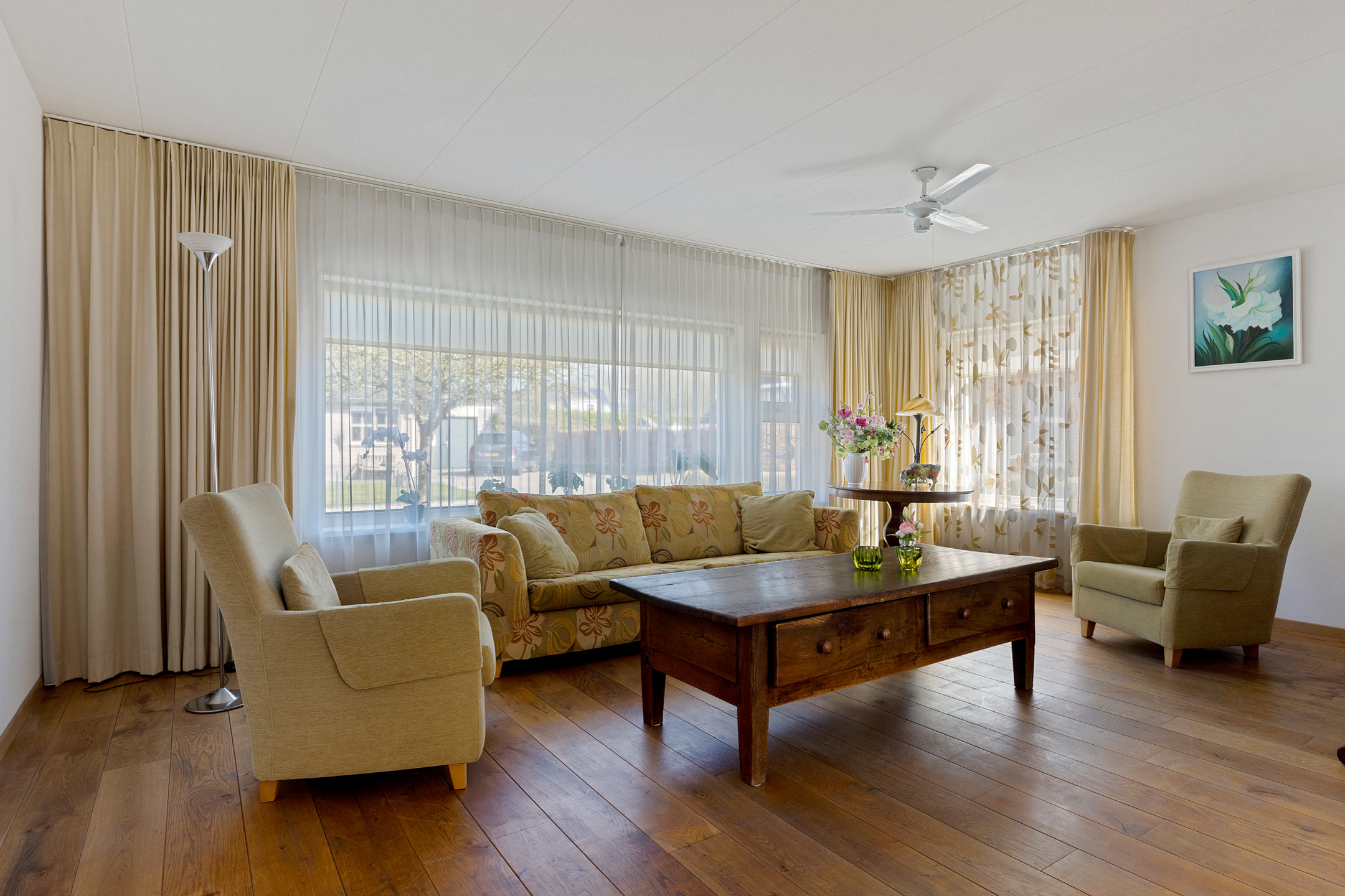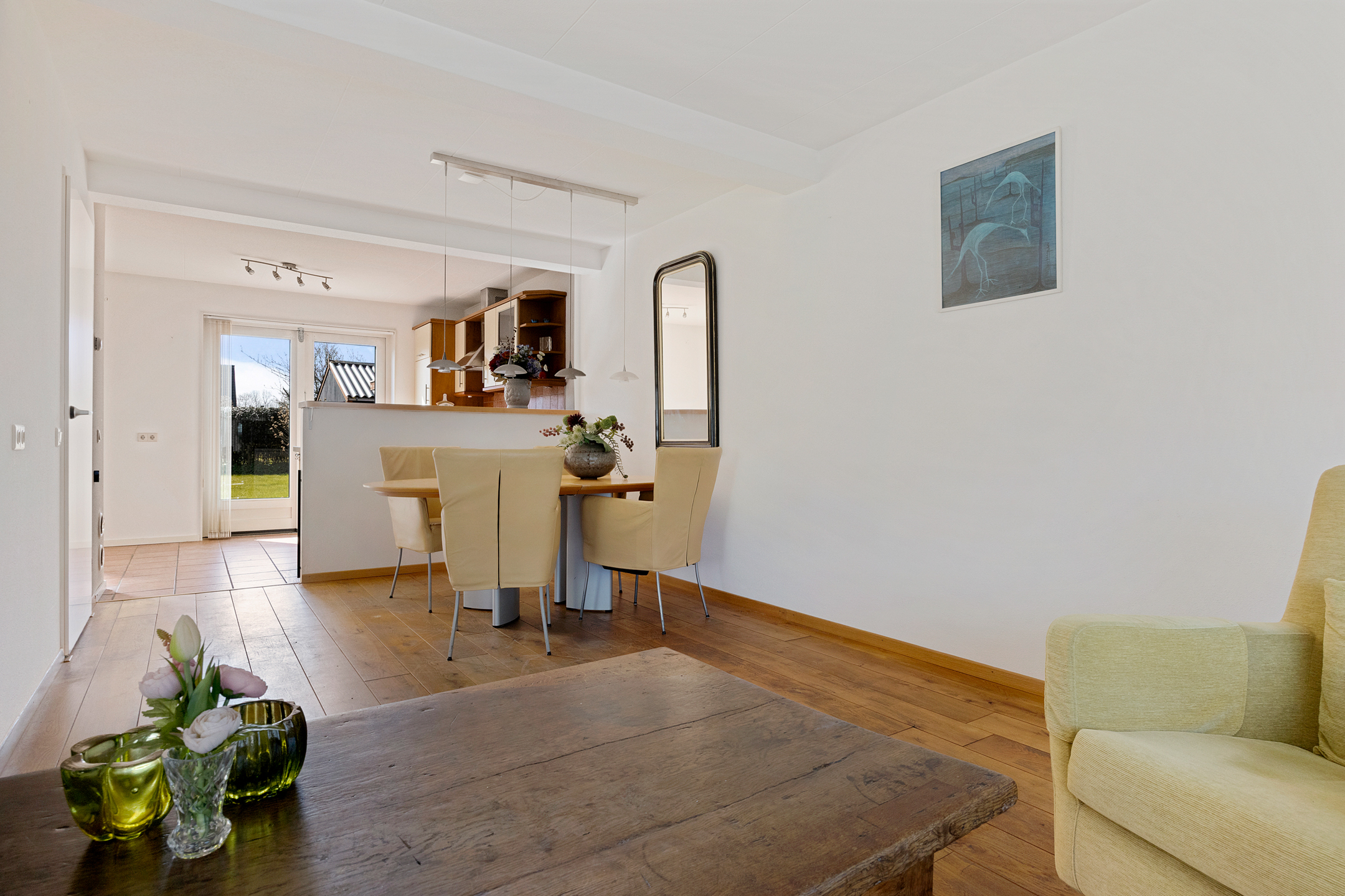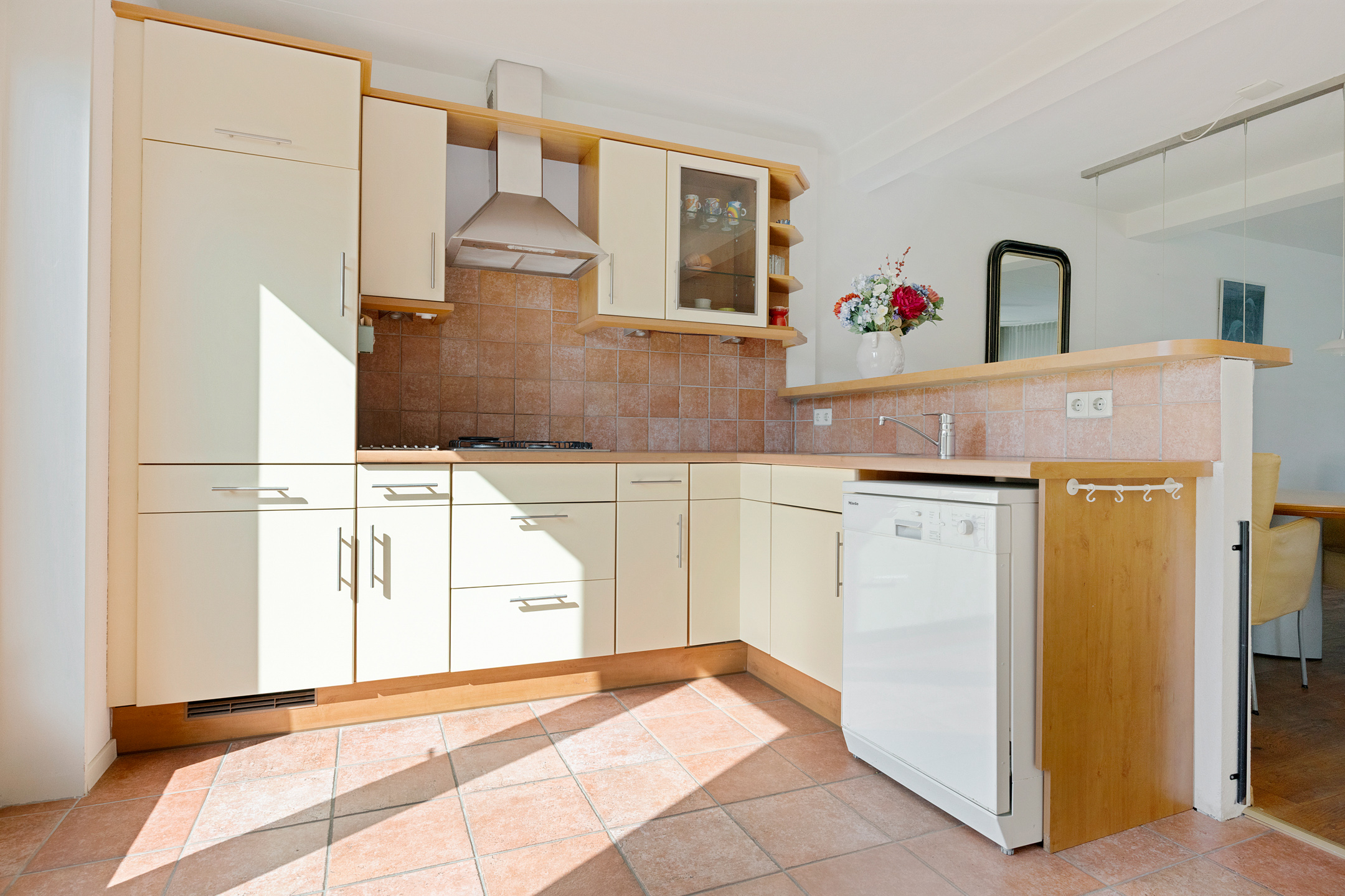 Entree, hal, toilet, meterkast, toegang tot de L-vormige woonkamer (ca. 31 m²) en de open keuken (ca. 10 m²) voorzien van vaatwasser, koelkast en kookplaat. Aansluitend de bijkeuken van ca. 5 m².