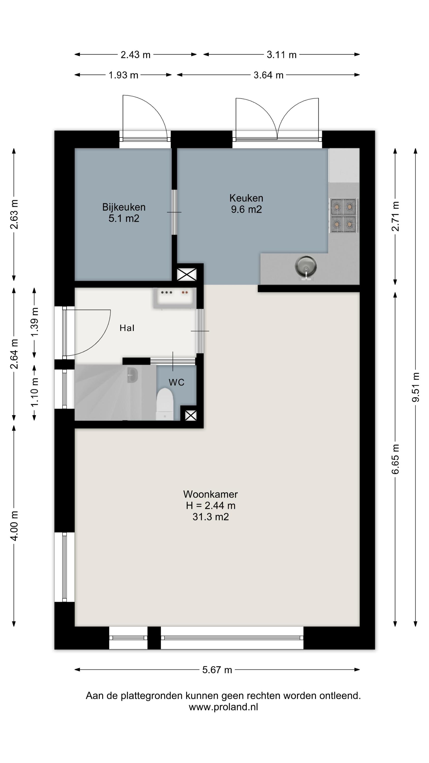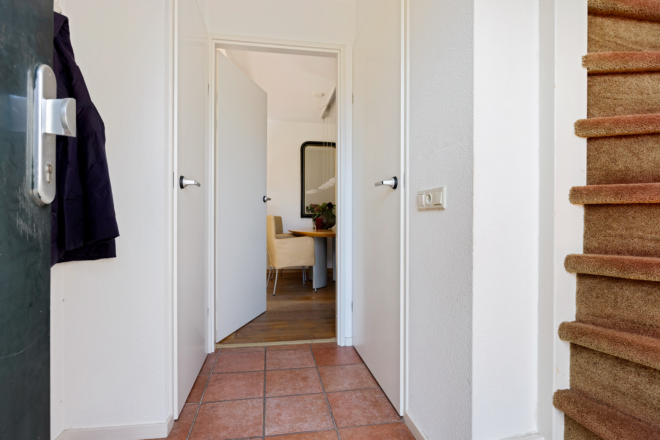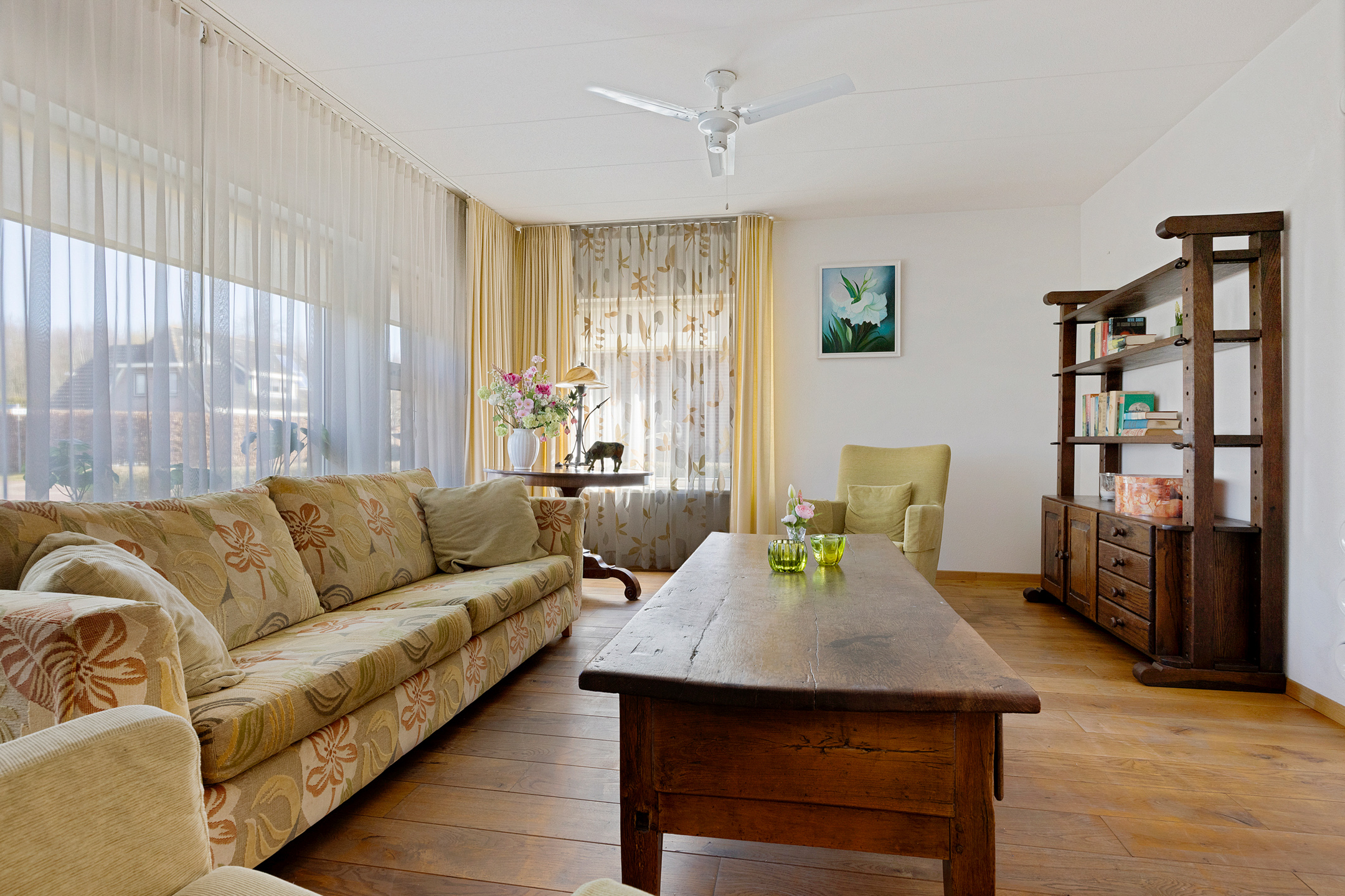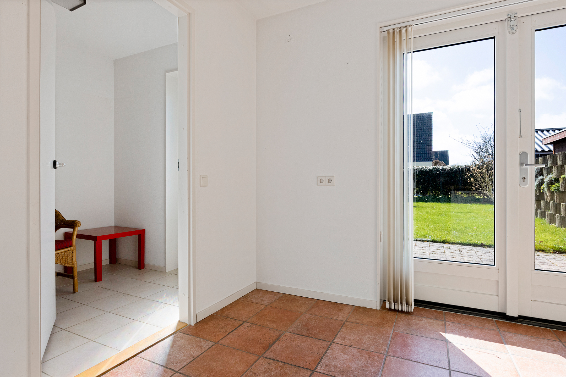 Entree, hal, toilet, meterkast, toegang tot de L-vormige woonkamer (ca. 31 m²) en de open keuken (ca. 10 m²) voorzien van vaatwasser, koelkast en kookplaat. Aansluitend de bijkeuken van ca. 5 m².
