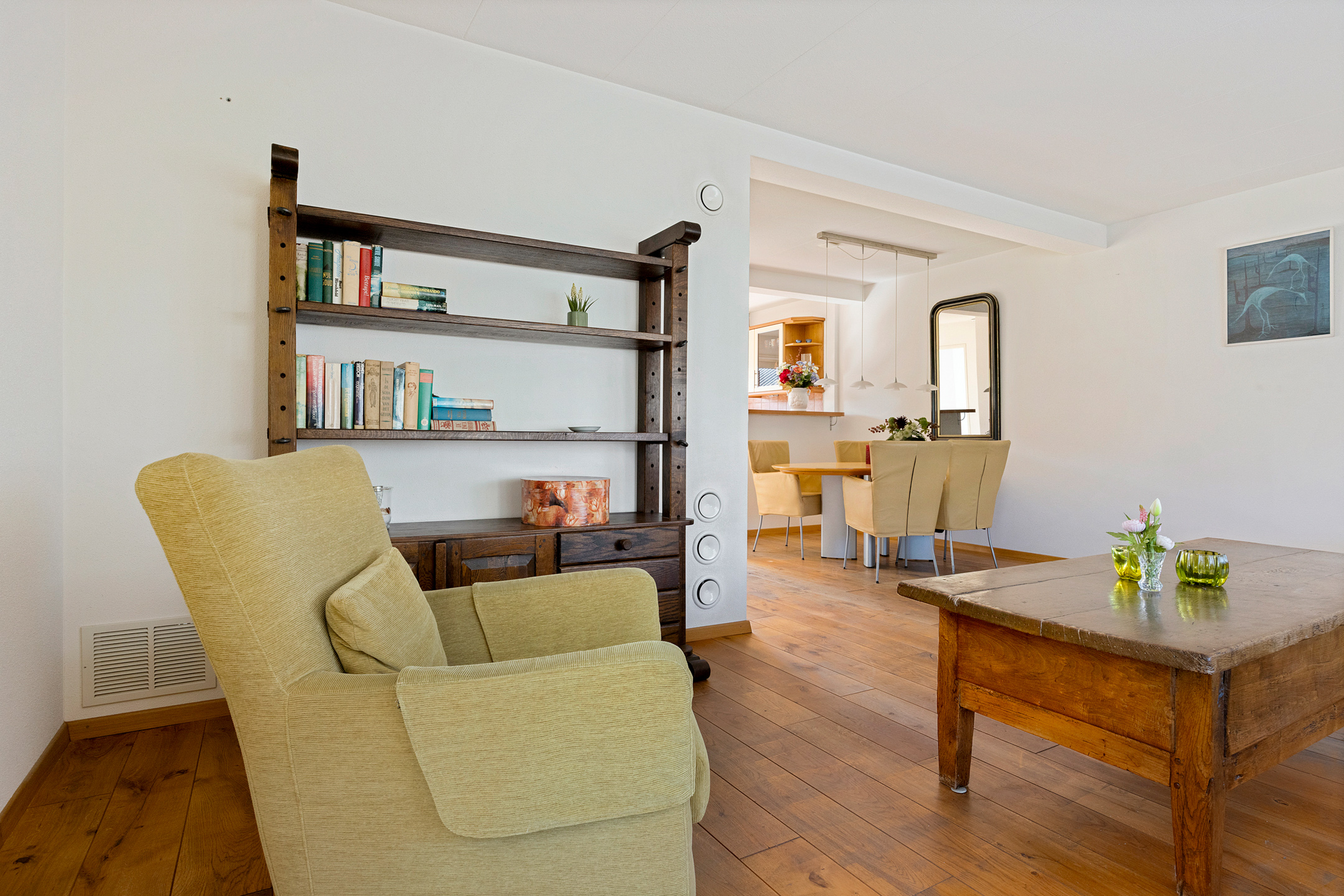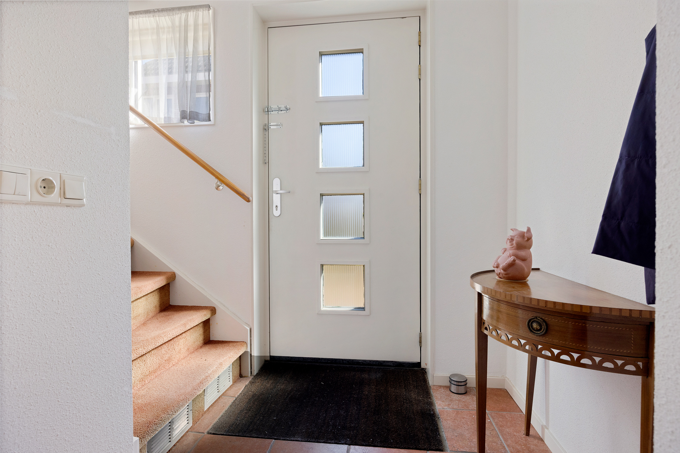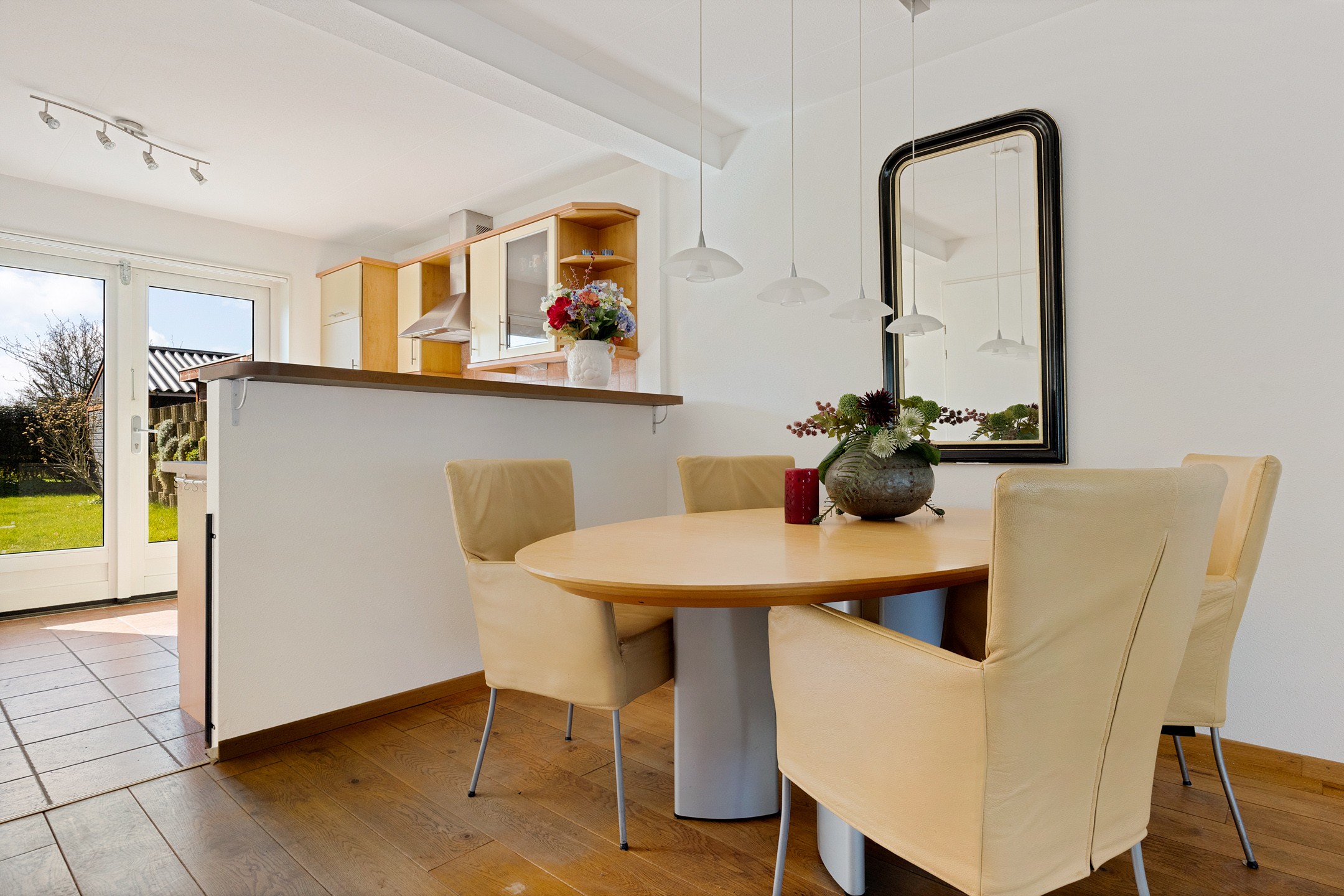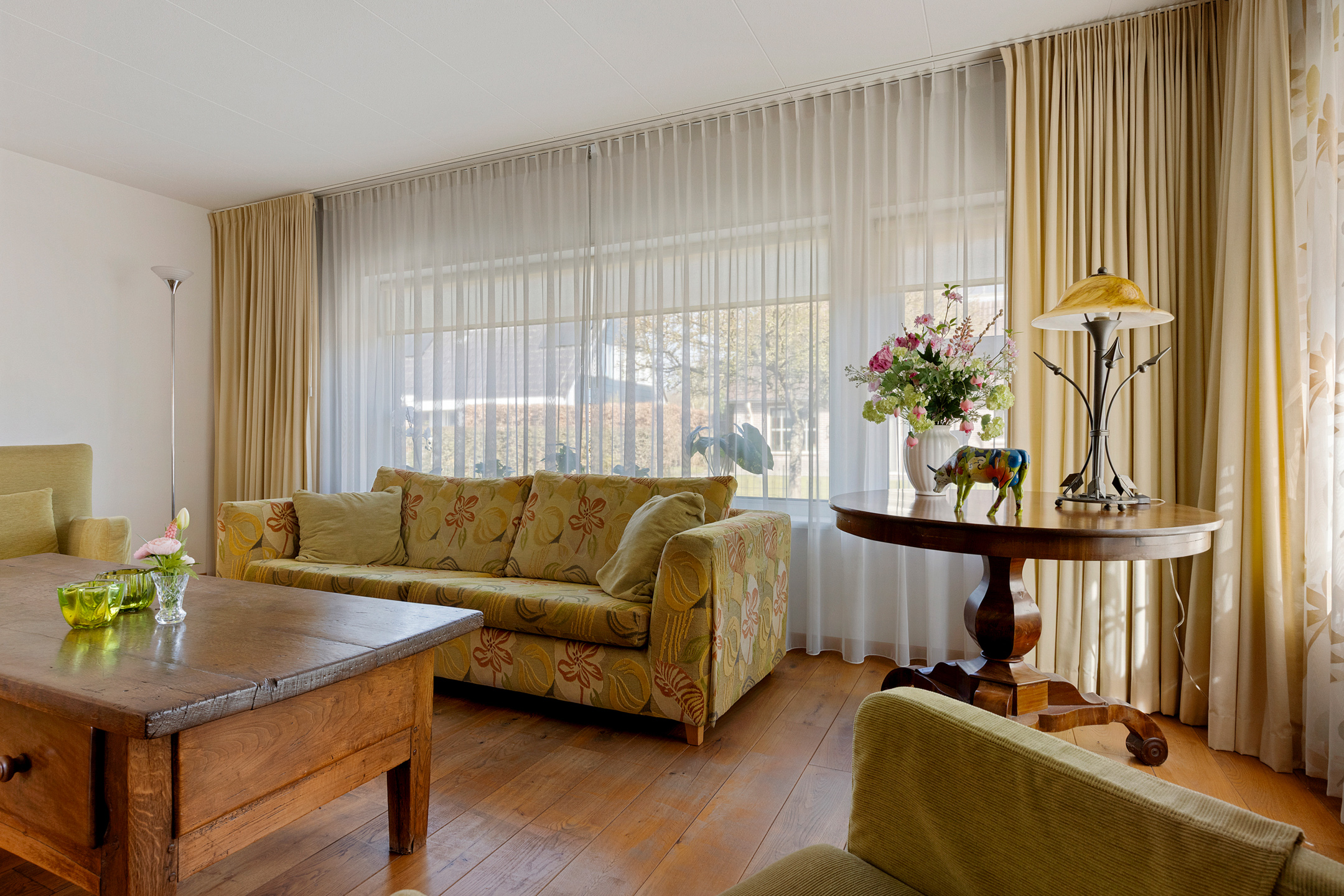 Entree, hal, toilet, meterkast, toegang tot de L-vormige woonkamer (ca. 31 m²) en de open keuken (ca. 10 m²) voorzien van vaatwasser, koelkast en kookplaat. Aansluitend de bijkeuken van ca. 5 m².