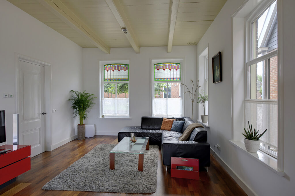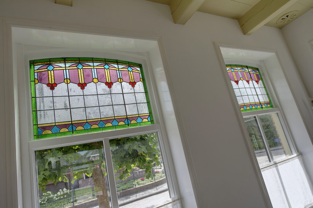 - Authentieke houten kozijnen met HR++ beglazing en deels voorzetramen met HR++ beglazing voor de glas-in-lood ramen;