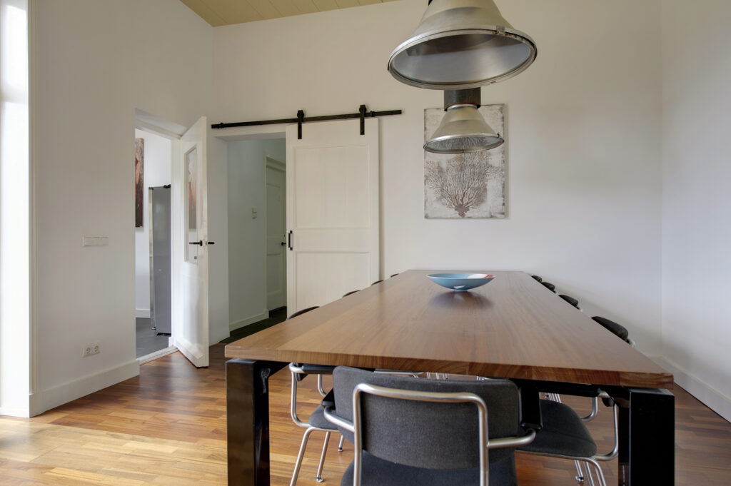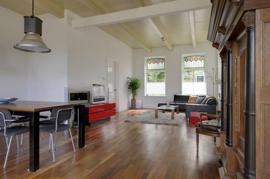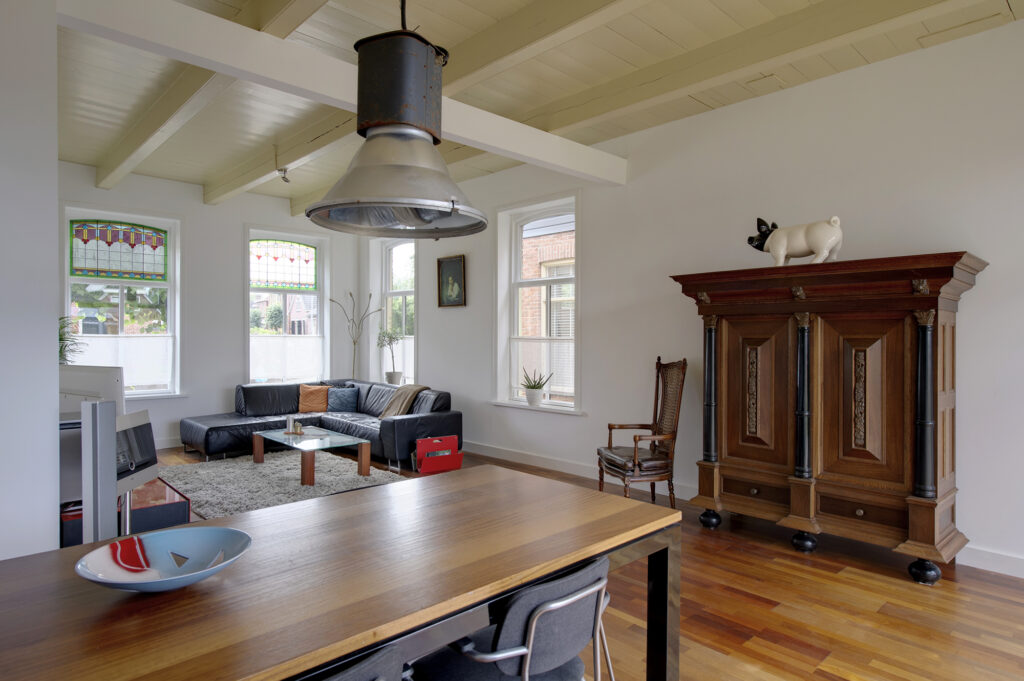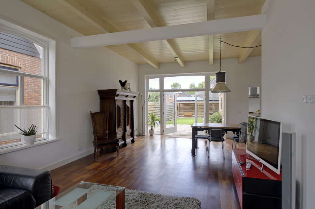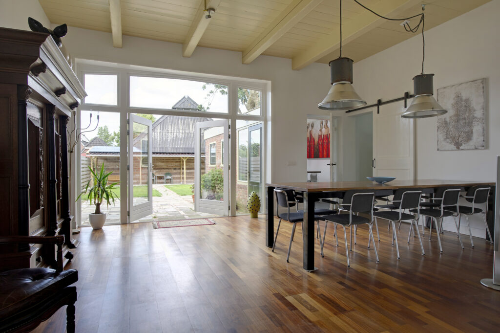 De woonkamer is het kloppende hart van de woning. Onder het hoge authentieke balkenplafond vindt u een zithoek, openslaande deuren naar de besloten royale tuin van ca. 180m2, en een eethoek die uitnodigt om met een groot gezelschap te tafelen. De eethoek vormt de verbinding tussen de keuken en de kamer.