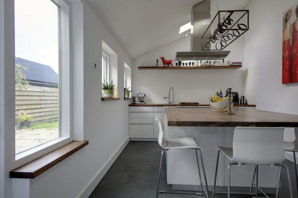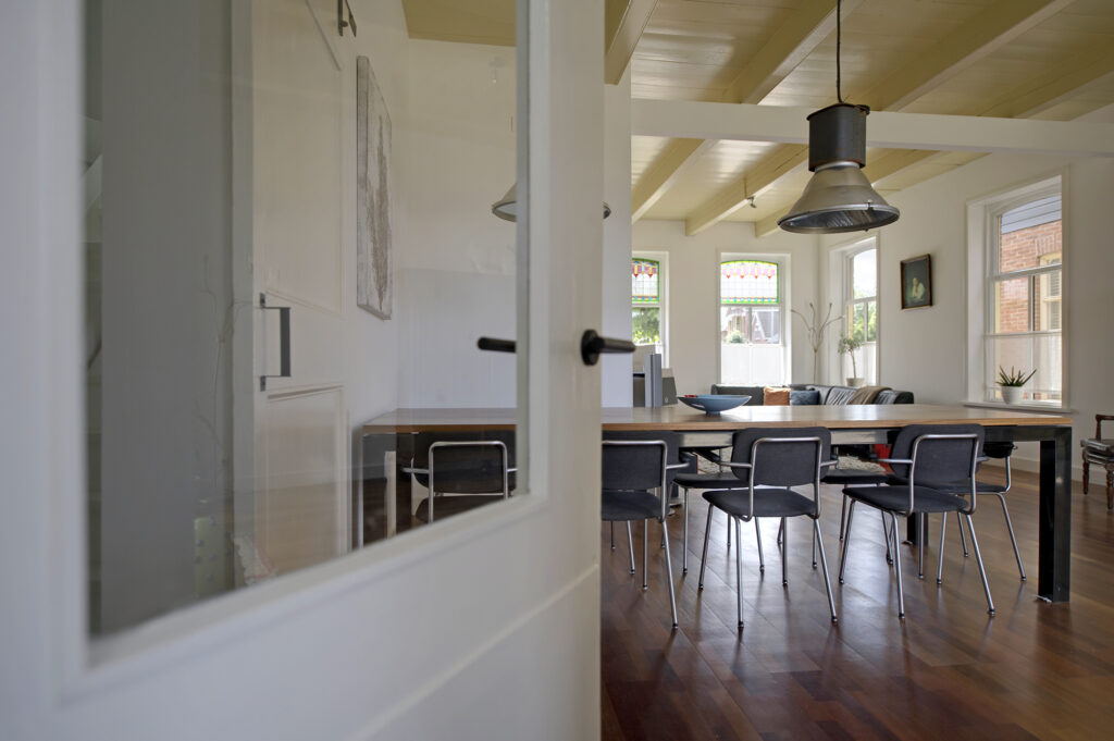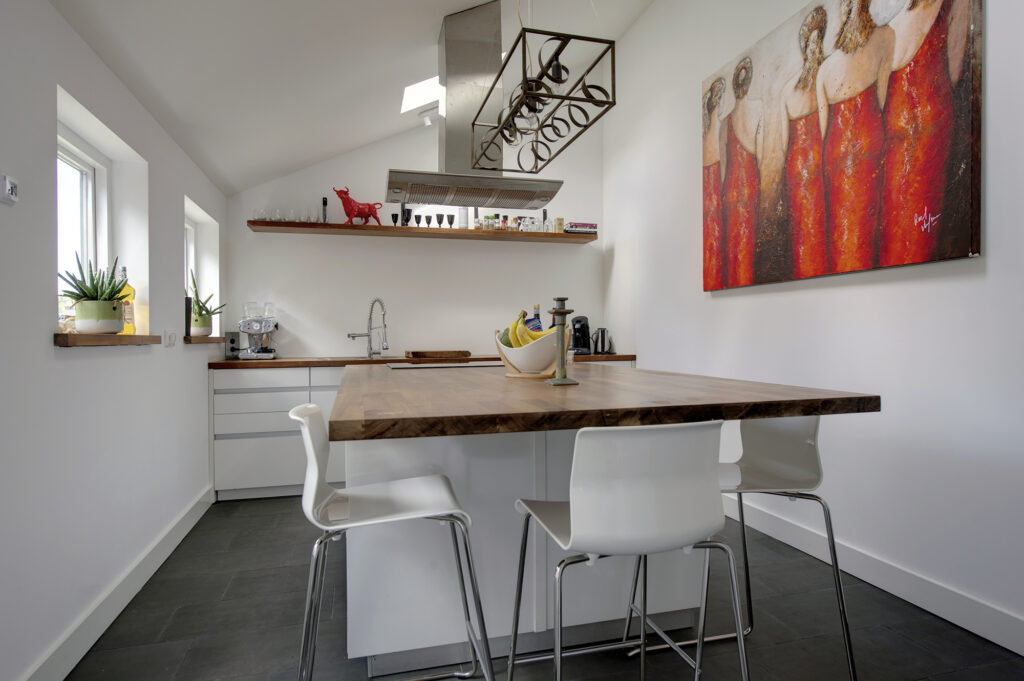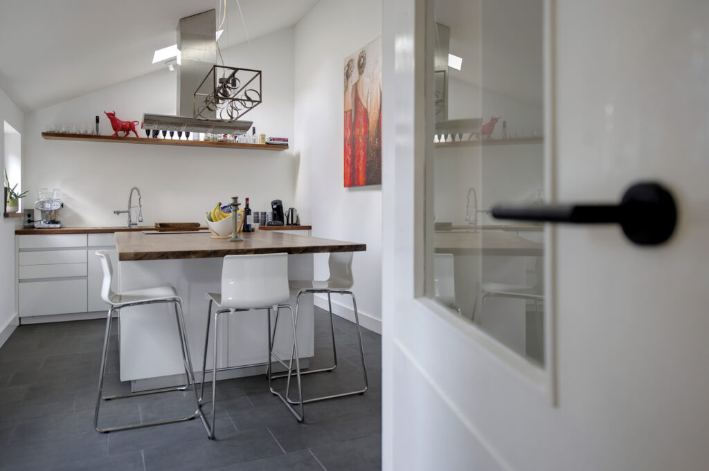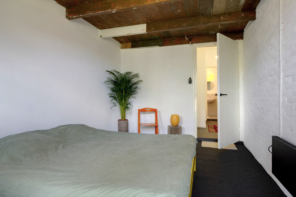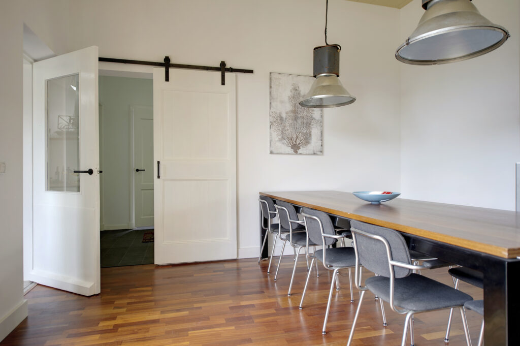 De woonkamer is het kloppende hart van de woning. Onder het hoge authentieke balkenplafond vindt u een zithoek, openslaande deuren naar de besloten royale tuin van ca. 180m2, en een eethoek die uitnodigt om met een groot gezelschap te tafelen. De eethoek vormt de verbinding tussen de keuken en de kamer.