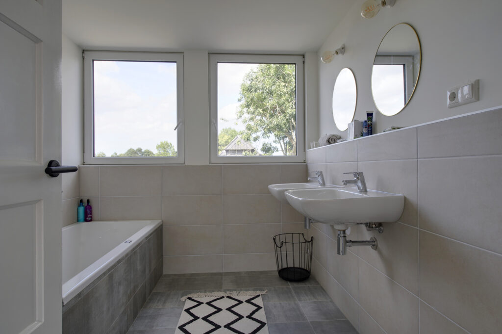 Door een vaste trap bereik je de overloop met aangrenzend een aantal slaapkamers 2 stuks van ca. 7 m² en een tweetal van ca.14 m² en moderne badkamer uit 2022 (ca. 7 m²); voorzien van rainshower, jacuzzi, zwevend toilet en dubbele wastafels.