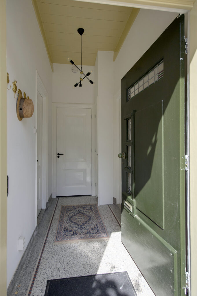 Entree/hal met authentieke terrazzovloer en voordeur. De originele paneeldeuren geven toegang tot: de werk- annex slaapkamer (ca. 15 m²); een royale toiletruimte met zwevend toilet en fontein; de zeer riante L-vormige woonkamer (ca. 46 m²met vloerverwarming).