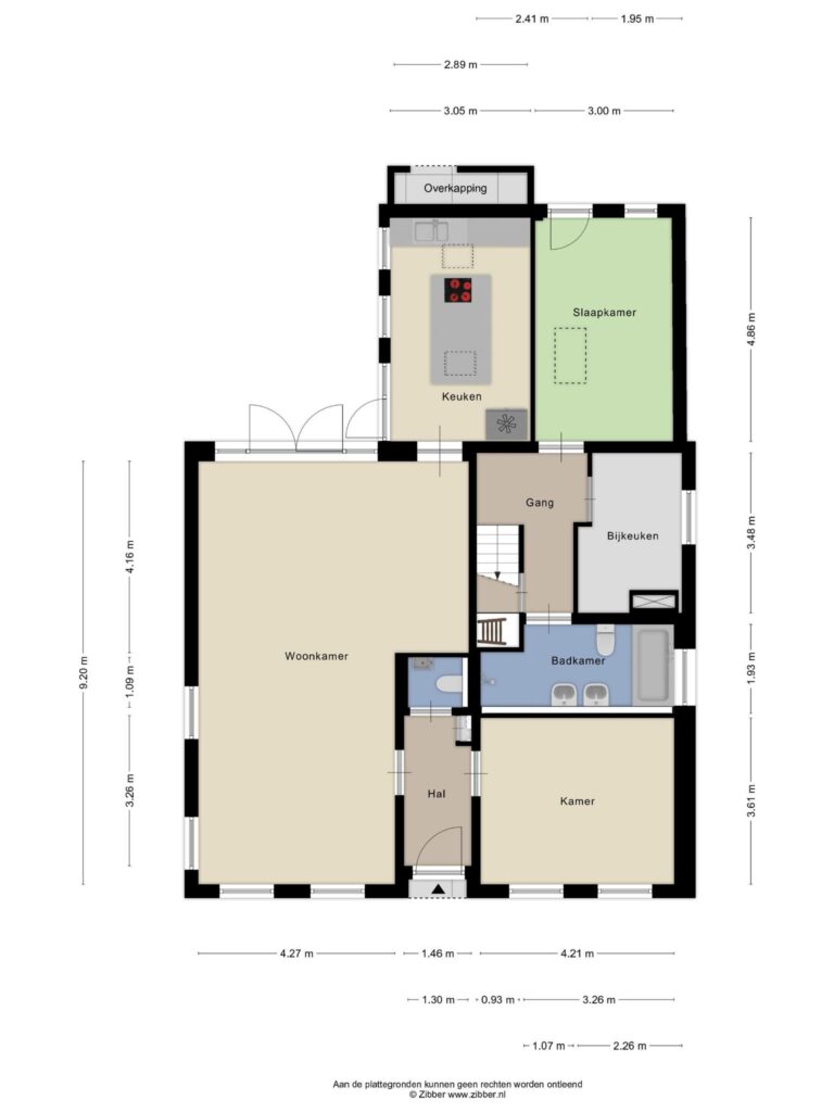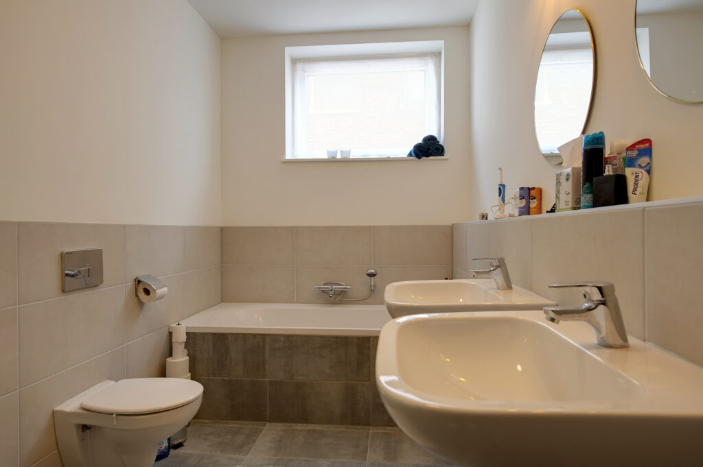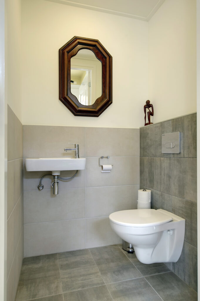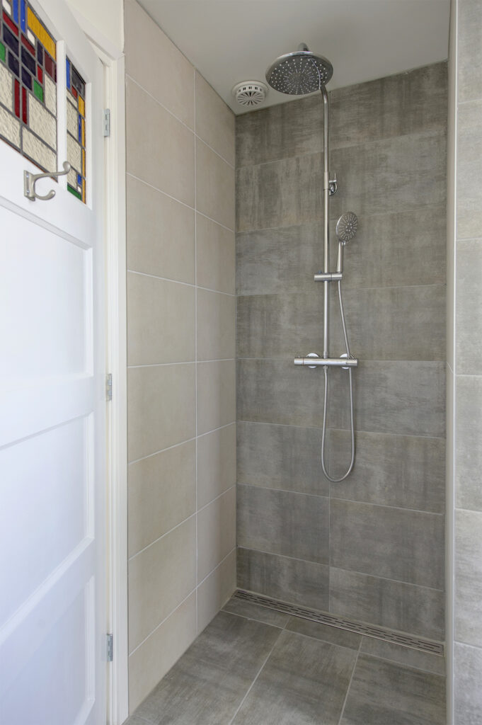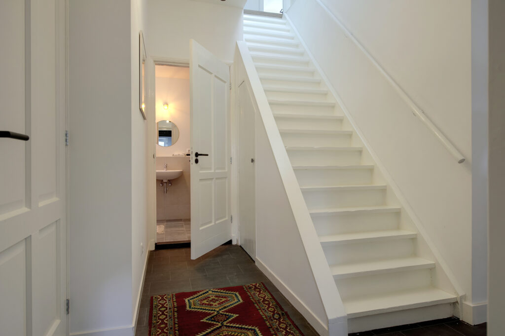 Vanuit de woonkamer is middels een schuifdeur de gang te bereiken. Onder de trap naar de eerste verdieping is een grote diepe inbouwkast en de toegang naar de kelder (ca. 12 m²) en aangrenzend een moderne smaakvolle badkamer uit 2022 (ca. 8 m²; met rainshower, twee wastafels, ligbad en zwevend toilet), een bijkeuken (ca. 7 m²; met witgoedaansluiting, en een tweede keukentje (met terrazzo werkblad) en slaapkamer (ca. 15 m²; met bergzoldertje en tuindeur). De slaapkamer met eigen toegang is bijvoorbeeld ook uitermate geschikt als een B&B slaapkamer.
