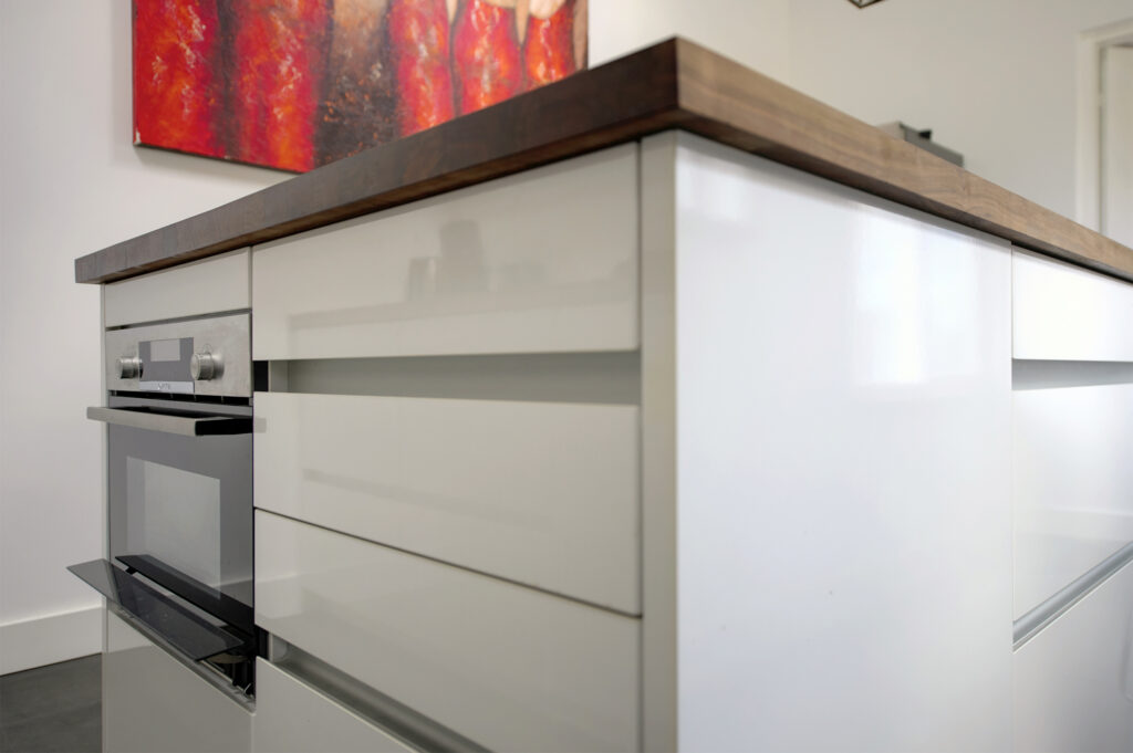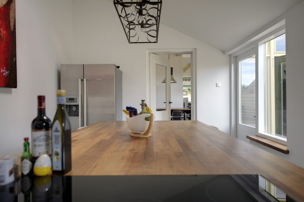 De woonkeuken (Leicht 2023, ca. 14 m²; incl. achterdeur) met een kookeiland c.q. ontbijtbar en keukenblok, is afgewerkt met een mahoniehouten blad en voorzien van moderne inbouwapparatuur waaronder vaatwasser, combi oven/magnetron, inductiekookplaat voorzien. De vele greeploze lades geven erg veel opbergruimte, wat ideaal is voor mooi servies, glazen en voorraad.