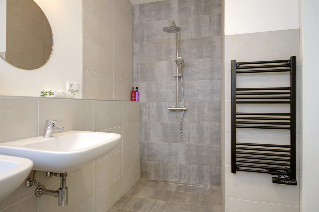 - Verwarming middels elektrische vloerverwarming in woonkamer en keuken en elektrische radiatoren in de overige ruimtes;