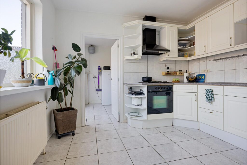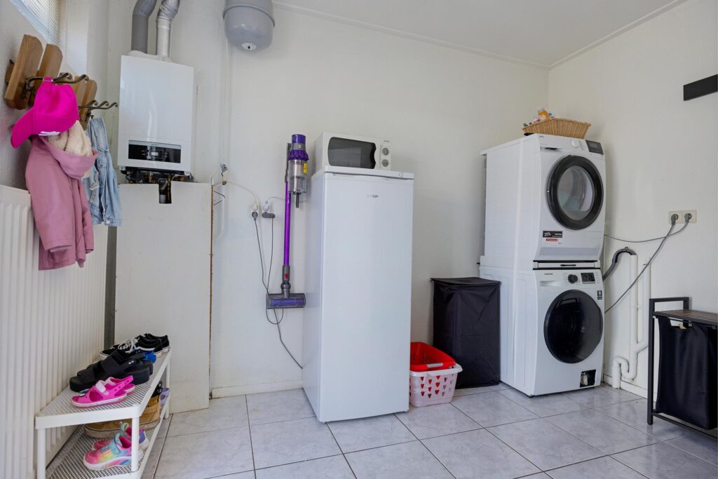 Intern beschikt het geheel over een centrale hal voorzien van meterkast, provisieruimte, modern toilet en trapopgang naar de eerste verdieping. Daarnaast biedt het toegang tot de L-vormige woonkamer voorzien van PVC en verbinding met de dichte eetkeuken. Deze dichte keuken biedt plaats aan een keurige inrichting en sluit aan op de bijkeuken met witgoedaansluiting en buitendeur. Op de eerste verdieping bevinden zich vervolgens drie slaapkamers - waarvan twee met vaste kasten - en een keurige badkamer met douche en wastafelmeubeltje alsmede een vlizotrap naar de vliering op de tweede verdieping.