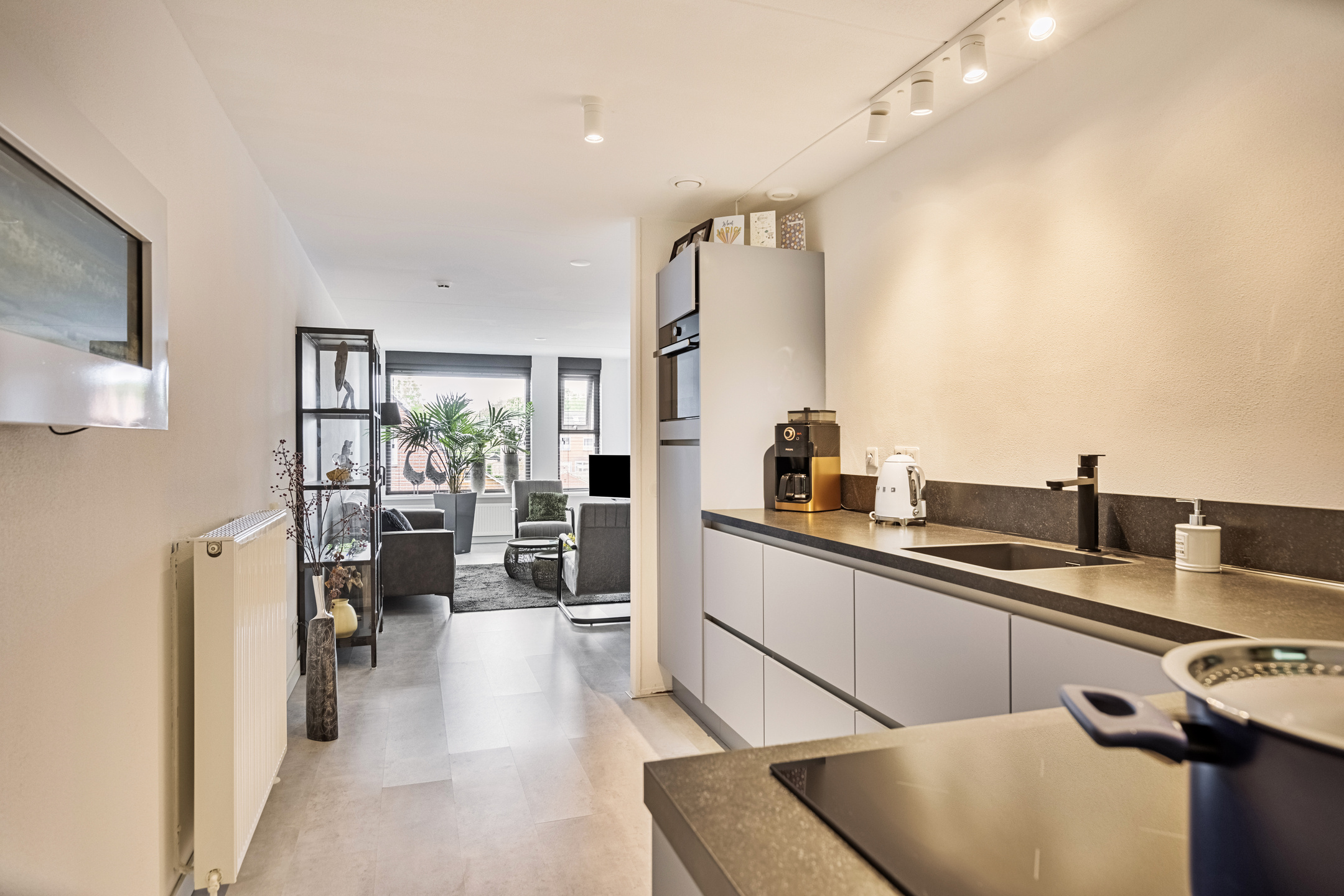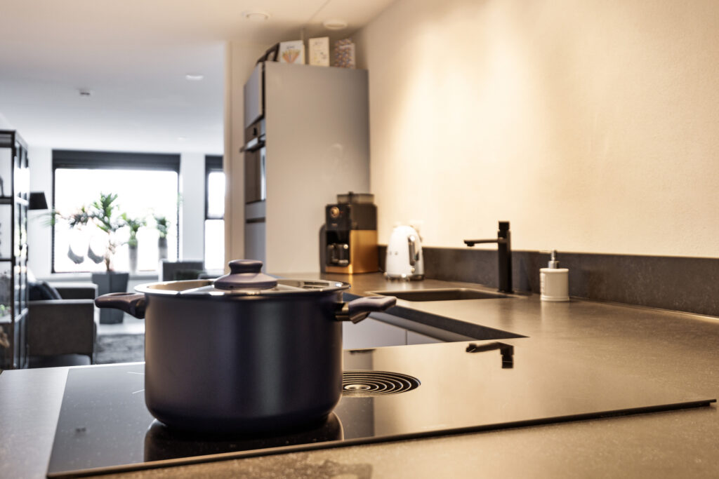 Woonkamer met een laminaatvloer en aansluitend de luxe open keuken voorzien van een kookeiland en inbouwapparatuur zoals inductiekookplaat, koelkast en combi-oven. Vanuit de woonkamer toegang tot de slaapkamer van ca. 13 m² met kastenwand en toegang tot het balkon van ca. 7 m².
