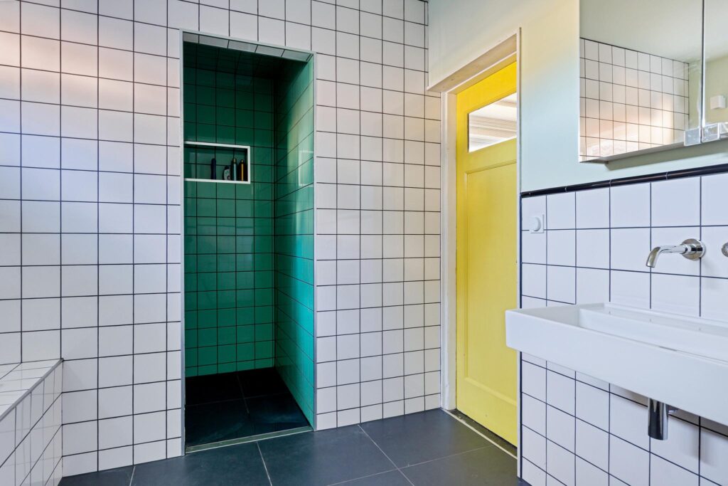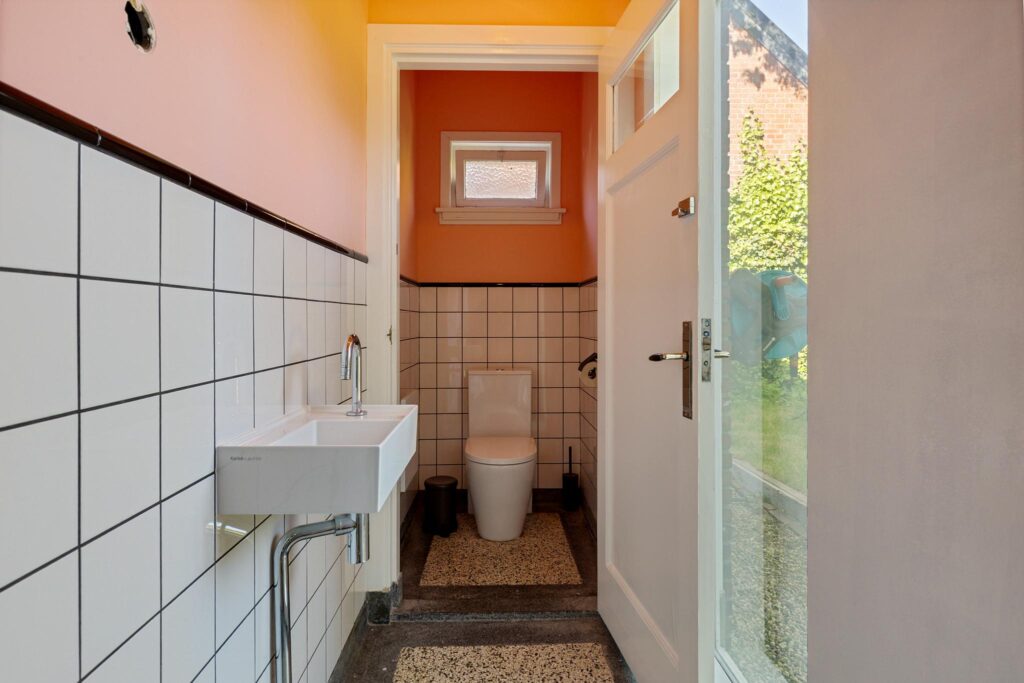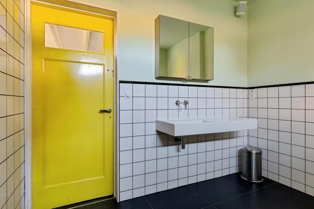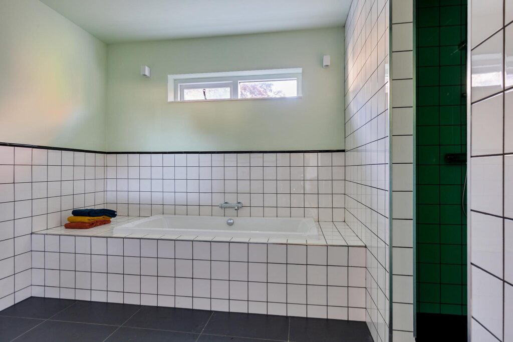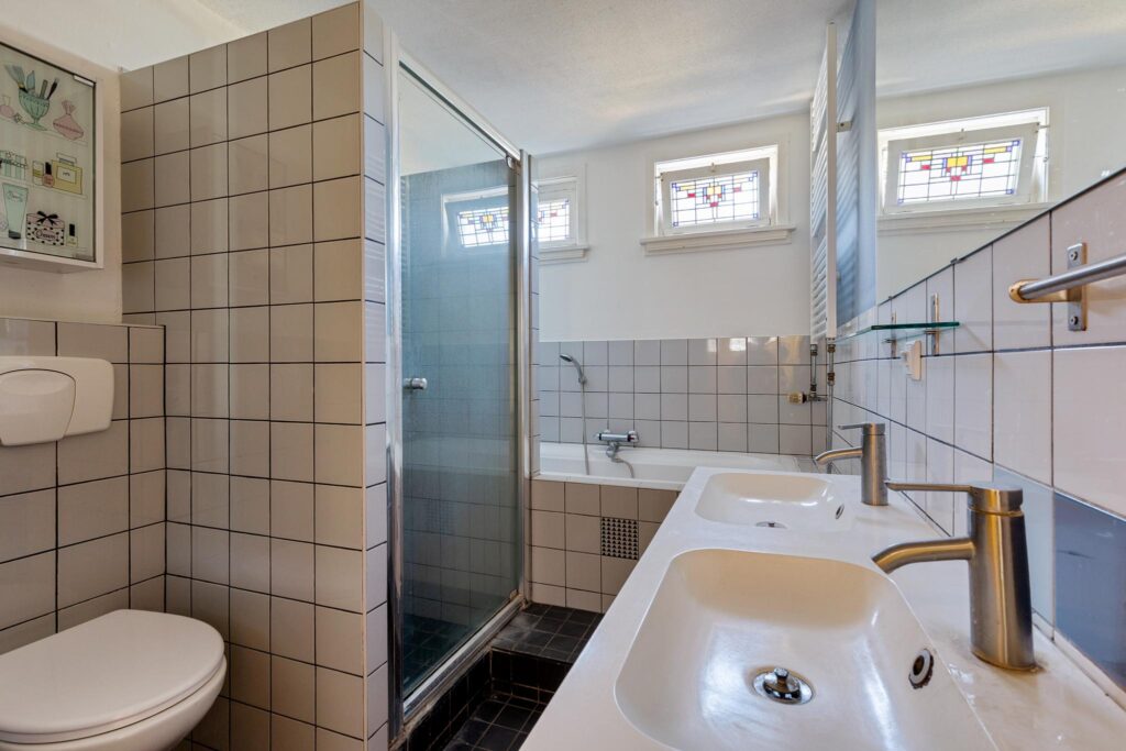 De badkamer (vernieuwd in 2024) van ca. 7 m² is voorzien van een ligbad, douche, toilet en dubbele wastafel.
