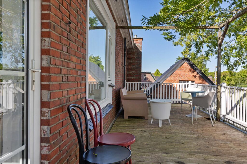 Middels een overloop op de verdieping toegang tot een woonkamer aan de voorzijde van het pand van ca. 37 m². Tevens toegang tot een dichte keuken van ca. 11 m² met inbouwapparatuur zoals gasfornuis met afzuigkap, magnetron, oven en vaatwasser. Twee slaapkamers van ca. 8 en 18 m² en een heerlijke living (woonkeuken) van ca. 36 m² waar je middels openslaande deuren toegang hebt tot een ruim balkon van ca. 13 m² (zuidoosten) en aan de achterzijde (middels een deur) een dakterras van ca. 27 m² (noord).